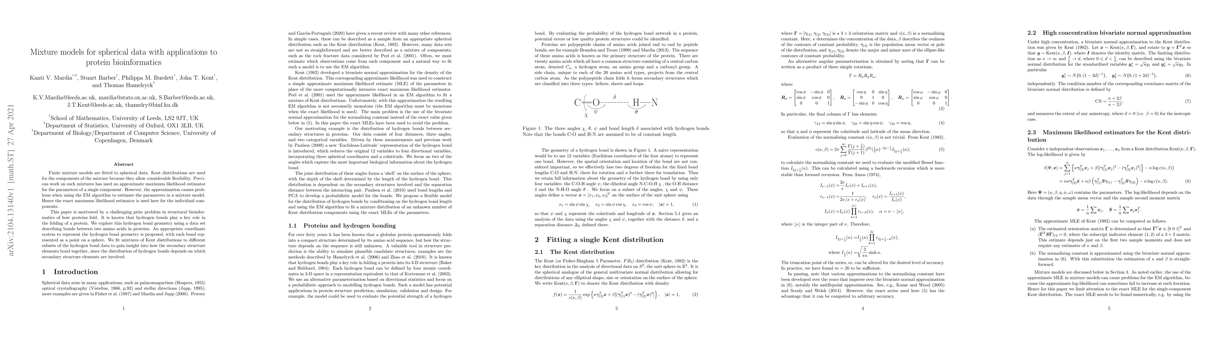 Finite mixture models are fitted to spherical data. Kent distributions are used for the components of the mixture because they allow considerable flexibility. Previous work on such mixtures has used an approximate maximum likelihood estimator for the parameters of a single component. However, the approximation causes problems when using the EM algorithm to estimate the parameters in a mixture model. Hence the exact maximum likelihood estimator is used here for the individual components. This paper is motivated by a challenging prize problem in structural bioinformatics of how proteins fold. It is known that hydrogen bonds play a key role in the folding of a protein. We explore this hydrogen bond geometry using a data set describing bonds between two amino acids in proteins. An appropriate coordinate system to represent the hydrogen bond geometry is proposed, with each bond represented as a point on a sphere. We fit mixtures of Kent distributions to different subsets of the hydrogen bond data to gain insight into how the secondary structure elements bond together, since the distribution of hydrogen bonds depends on which secondary structure elements are involved.