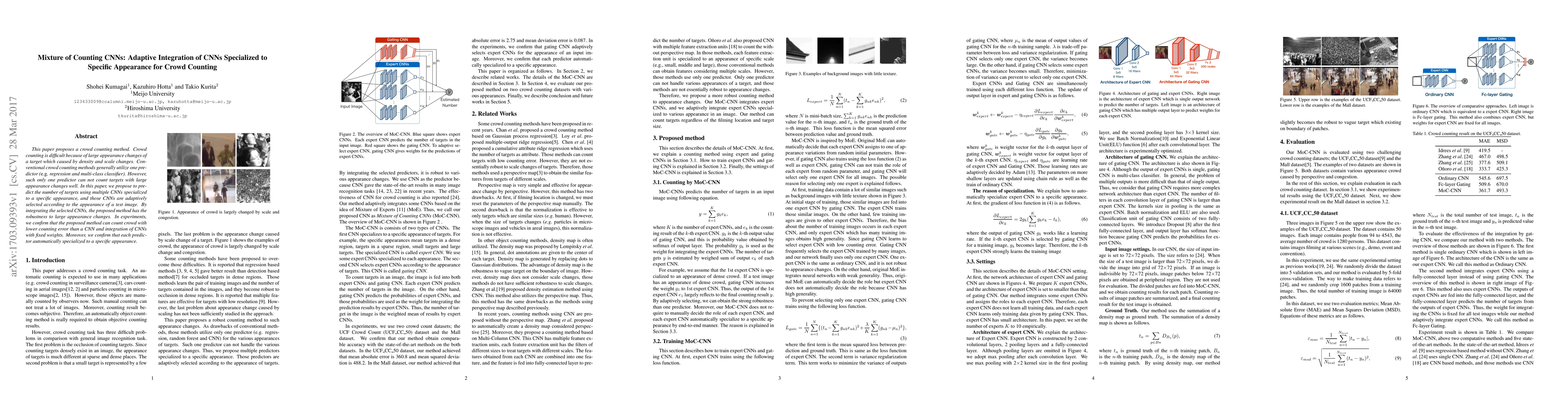This paper proposes a crowd counting method. Crowd counting is difficult because of large appearance changes of a target which caused by density and scale changes. Conventional crowd counting methods generally utilize one predictor (e,g., regression and multi-class classifier). However, such only one predictor can not count targets with large appearance changes well. In this paper, we propose to predict the number of targets using multiple CNNs specialized to a specific appearance, and those CNNs are adaptively selected according to the appearance of a test image. By integrating the selected CNNs, the proposed method has the robustness to large appearance changes. In experiments, we confirm that the proposed method can count crowd with lower counting error than a CNN and integration of CNNs with fixed weights. Moreover, we confirm that each predictor automatically specialized to a specific appearance.