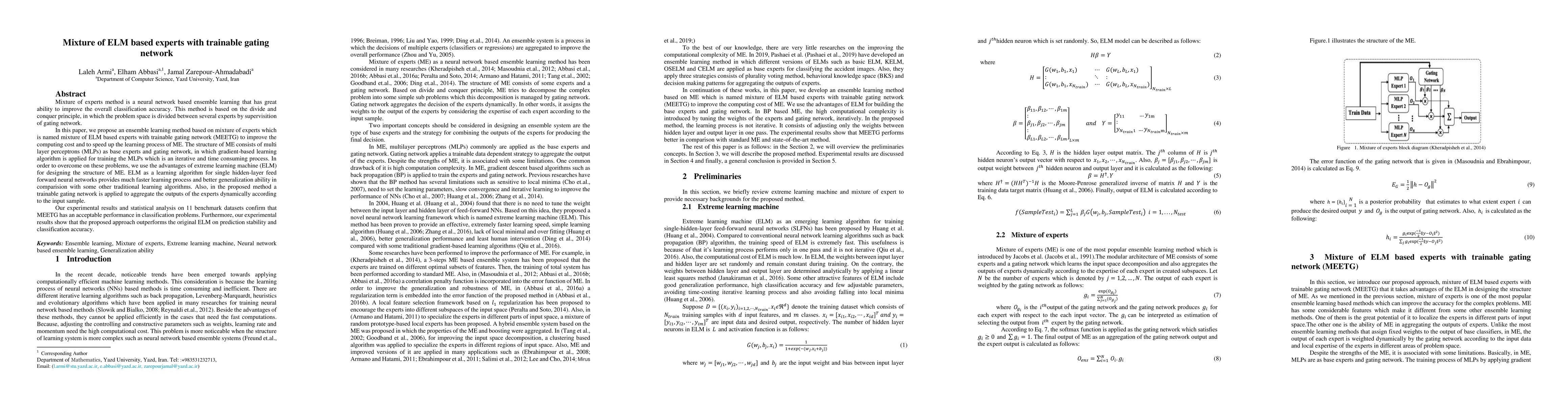 This paper proposes MEETG, a mixture of ELM-based experts with a trainable gating network, to enhance the efficiency and speed of ensemble learning. By leveraging the fast learning and generalization capabilities of ELM, it outperforms traditional MLPs and original ELM in terms of prediction stability and classification accuracy.
