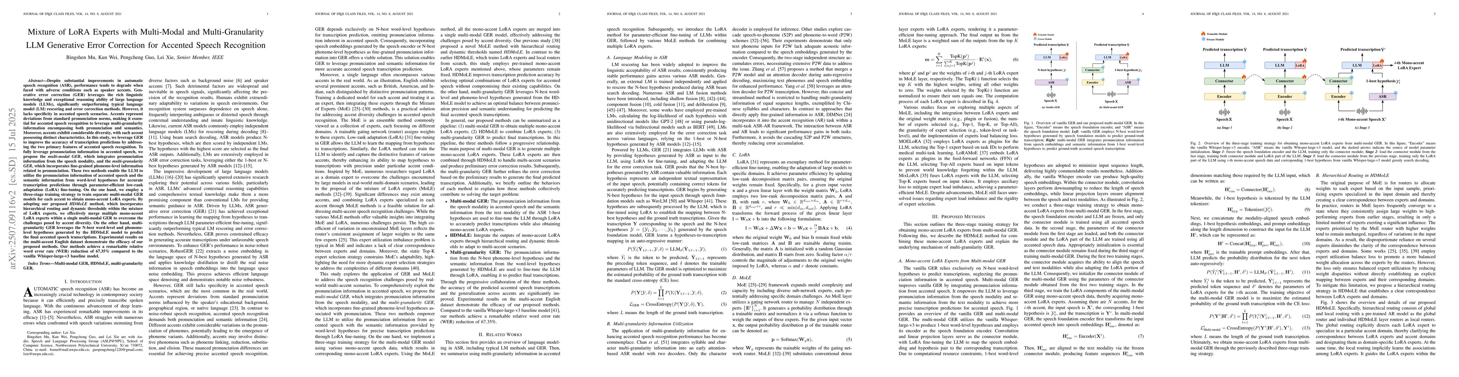 Despite substantial improvements in ASR, performance tends to degrade when faced with adverse conditions such as speaker accents. Generative error correction (GER) leverages the rich linguistic knowledge and exceptional reasoning ability of LLMs, significantly outperforming typical LM methods. However, it lacks specificity in accented speech scenarios. In this study, we leverage GER to improve the accuracy of transcription predictions by addressing the two primary features of accented speech recognition. To fully leverage pronunciation information, we propose the multi-modal GER, which integrates pronunciation information from the speech modality, and the multi-granularity GER, which incorporates fine-grained phoneme-level information related to pronunciation. These two methods enable the LLM to utilize the pronunciation information of accented speech and the semantic information from word-level hypotheses for accurate transcription predictions through LoRA fine-tuning. On the one hand, we employ a three-stage training strategy to train separate multi-modal GER models for each accent to obtain mono-accent LoRA experts. By adopting our proposed HDMoLE method, which incorporates hierarchical routing and dynamic thresholds within the mixture of LoRA experts, we effectively merge multiple mono-accent LoRA experts within a single multi-modal GER to overcome the challenges posed by accent diversity. On the other hand, multi-granularity GER leverages the N-best word-level and phoneme-level hypotheses generated by the HDMoLE model to predict the final accented speech transcriptions. Experimental results on the multi-accent English dataset demonstrate the efficacy of our proposed methods. Our methods achieve a remarkable relative WER reduction of 67.35% compared to the Whisper-large-v3 baseline.