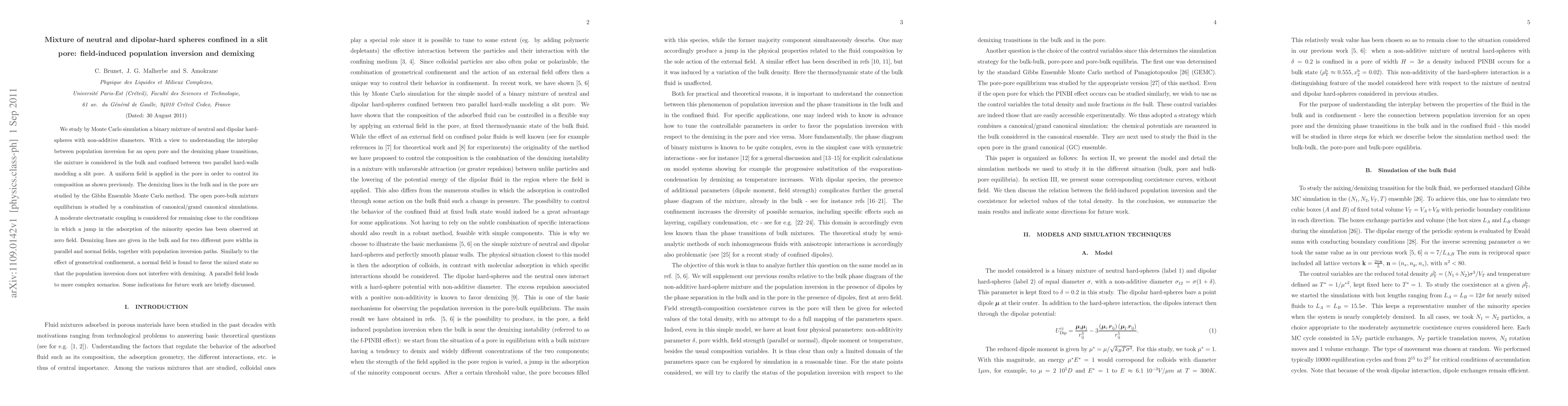 We study by Monte Carlo simulation a binary mixture of neutral and dipolar hard-spheres with non-additive diameters. With a view to understanding the interplay between population inversion for an open pore and the demixing phase transitions, the mixture is considered in the bulk and confined between two parallel hard-walls modeling a slit pore. A uniform field is applied in the pore in order to control its composition as shown previously. The demixing lines in the bulk and in the pore are studied by the Gibbs Ensemble Monte Carlo method. The open pore-bulk mixture equilibrium is studied by a combination of canonical/grand canonical simulations. A moderate electrostatic coupling is considered for remaining close to the conditions in which a jump in the adsorption of the minority species has been observed at zero field. Demixing lines are given in the bulk and for two different pore widths in parallel and normal fields, together with population inversion paths. Similarly to the effect of geometrical confinement, a normal field is found to favor the mixed state so that the population inversion does not interfere with demixing. A parallel field leads to more complex scenarios. Some indications for future work are briefly discussed.