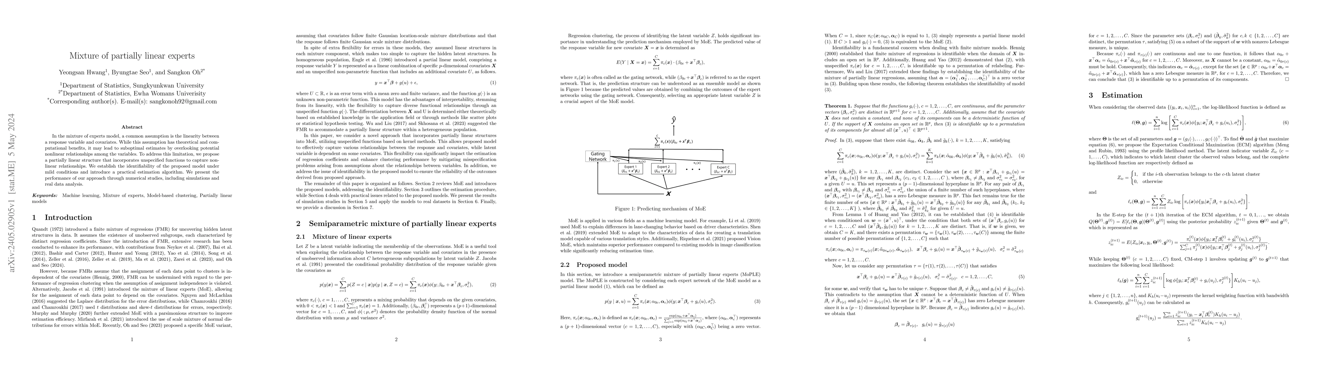 The paper proposes a partially linear mixture of experts model to capture nonlinear relationships in data, establishing its identifiability and introducing an estimation algorithm. Numerical studies demonstrate the method's effectiveness through simulations and real data analysis.