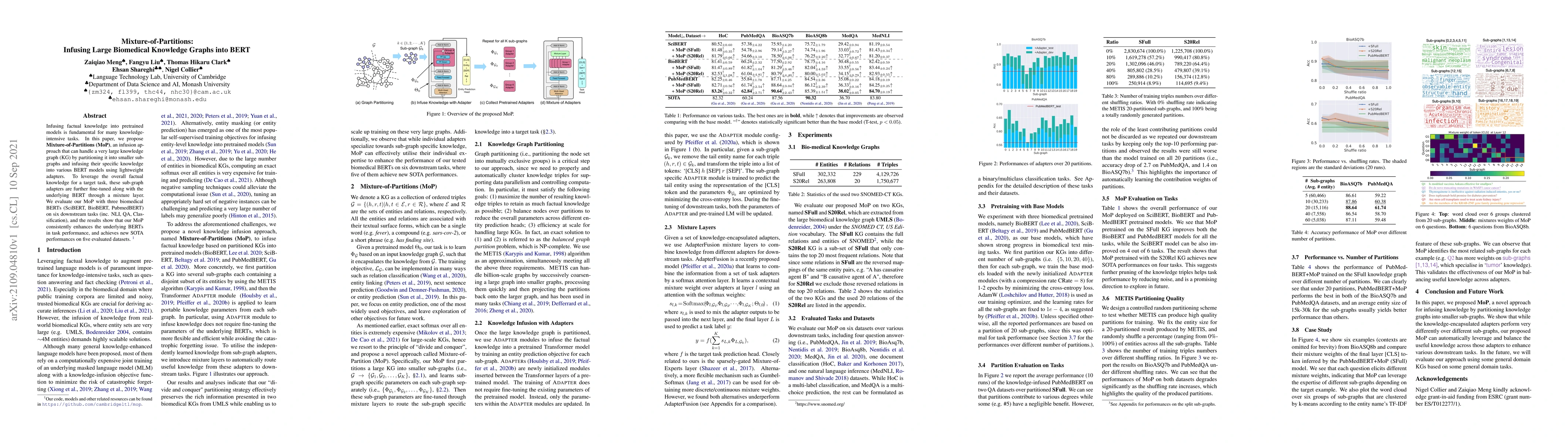 The paper proposes Mixture-of-Partitions (MoP), an approach that partitions large biomedical knowledge graphs into smaller sub-graphs and infuses them into various BERT models using adapters. This method achieves state-of-the-art results on multiple biomedical downstream tasks by leveraging a mixture layer to fine-tune sub-graph adapters.