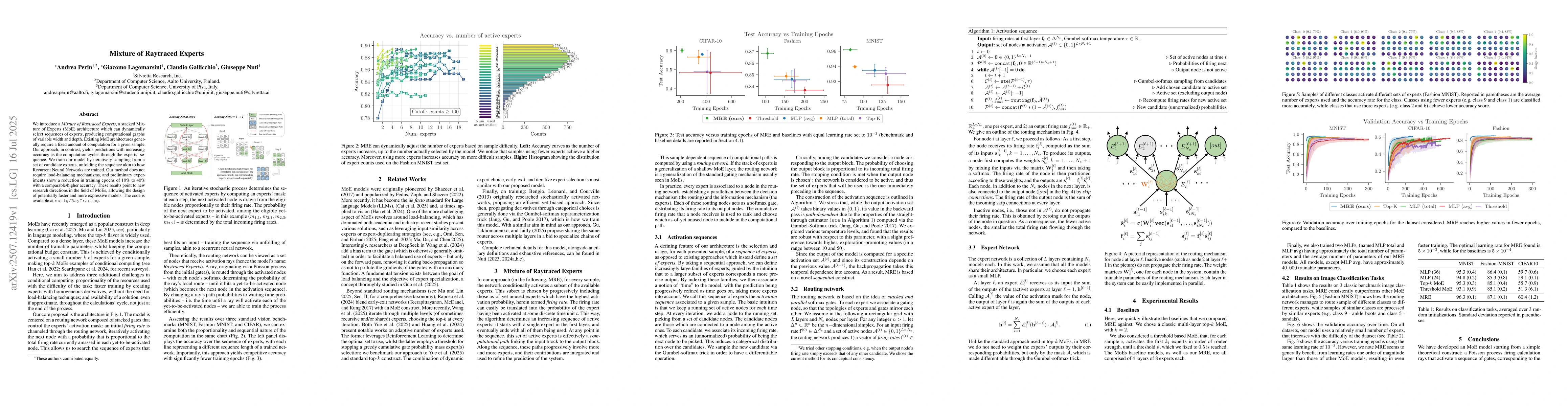 We introduce a Mixture of Raytraced Experts, a stacked Mixture of Experts (MoE) architecture which can dynamically select sequences of experts, producing computational graphs of variable width and depth. Existing MoE architectures generally require a fixed amount of computation for a given sample. Our approach, in contrast, yields predictions with increasing accuracy as the computation cycles through the experts' sequence. We train our model by iteratively sampling from a set of candidate experts, unfolding the sequence akin to how Recurrent Neural Networks are trained. Our method does not require load-balancing mechanisms, and preliminary experiments show a reduction in training epochs of 10\% to 40\% with a comparable/higher accuracy. These results point to new research directions in the field of MoEs, allowing the design of potentially faster and more expressive models. The code is available at https://github.com/nutig/RayTracing