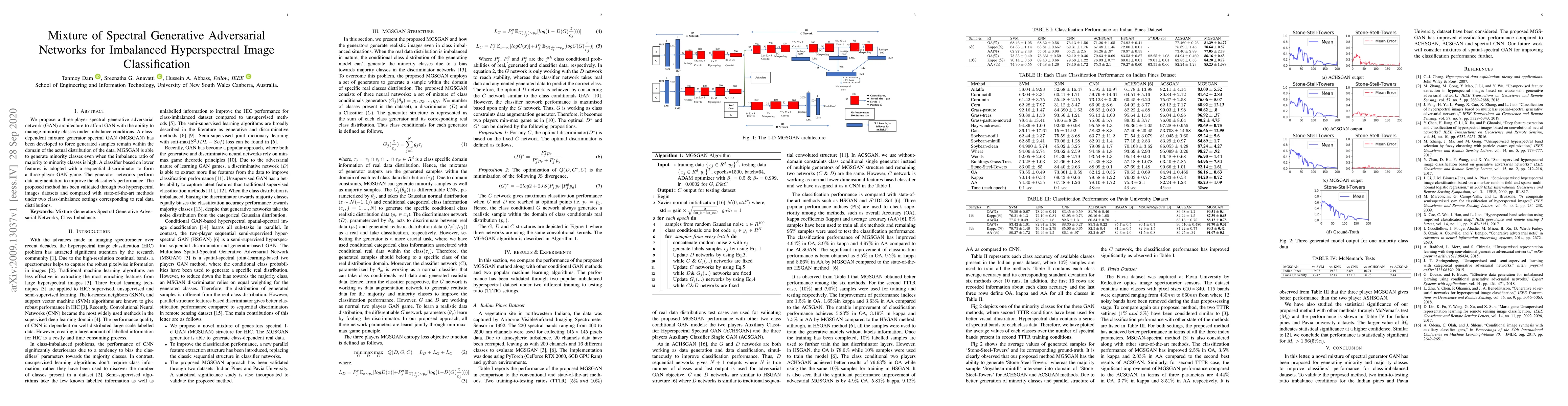 We propose a three-player spectral generative adversarial network (GAN) architecture to afford GAN with the ability to manage minority classes under imbalance conditions. A class-dependent mixture generator spectral GAN (MGSGAN) has been developed to force generated samples remain within the domain of the actual distribution of the data. MGSGAN is able to generate minority classes even when the imbalance ratio of majority to minority classes is high. A classifier based on lower features is adopted with a sequential discriminator to form a three-player GAN game. The generator networks perform data augmentation to improve the classifier's performance. The proposed method has been validated through two hyperspectral images datasets and compared with state-of-the-art methods under two class-imbalance settings corresponding to real data distributions.