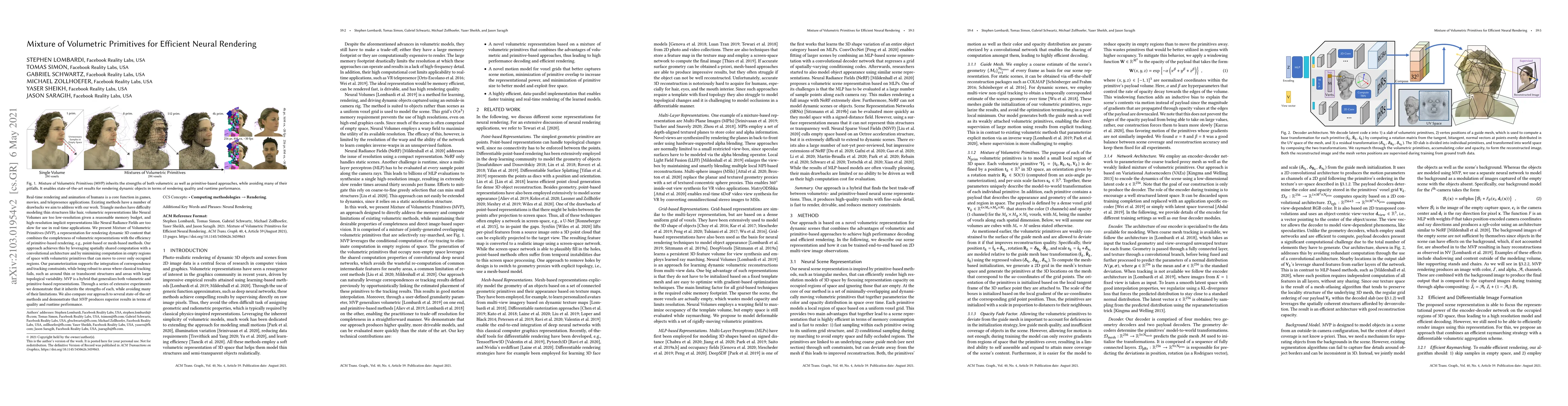 The Mixture of Volumetric Primitives (MVP) method efficiently combines volumetric and primitive-based rendering to model dynamic 3D content, achieving high-quality real-time rendering while avoiding the limitations of existing methods. MVP leverages spatially shared computation and adaptive volumetric primitives to optimize performance and accuracy.