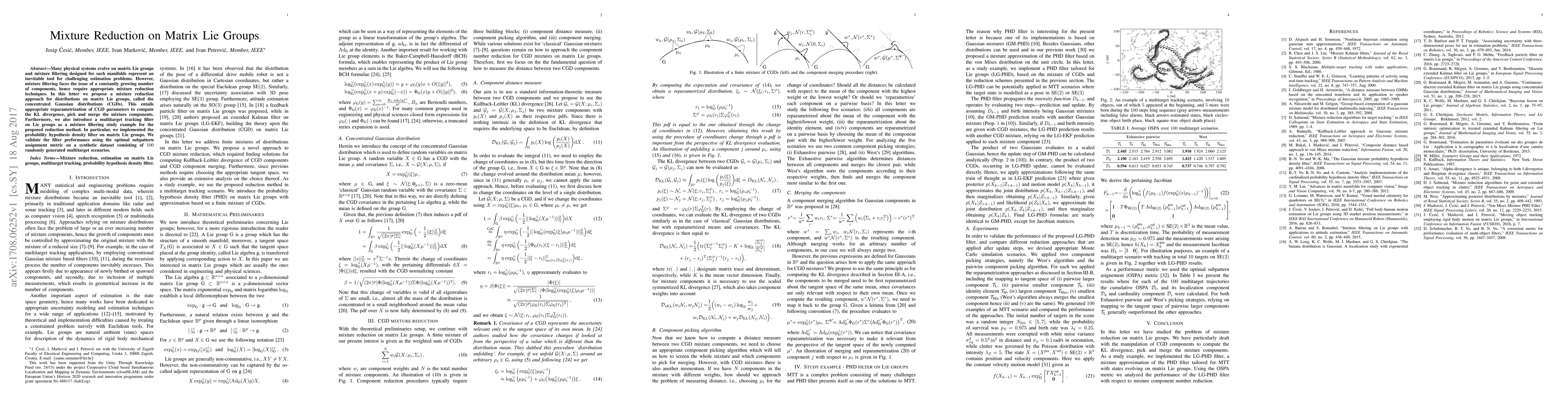 This paper proposes a mixture reduction approach for distributions on matrix Lie groups using concentrated Gaussian distributions (CGDs) to manage the growing number of components in mixture filtering. It also introduces a probability hypothesis density filter on Lie groups for multitarget tracking and validates its performance using optimal subpattern assignment metrics on synthetic data.
