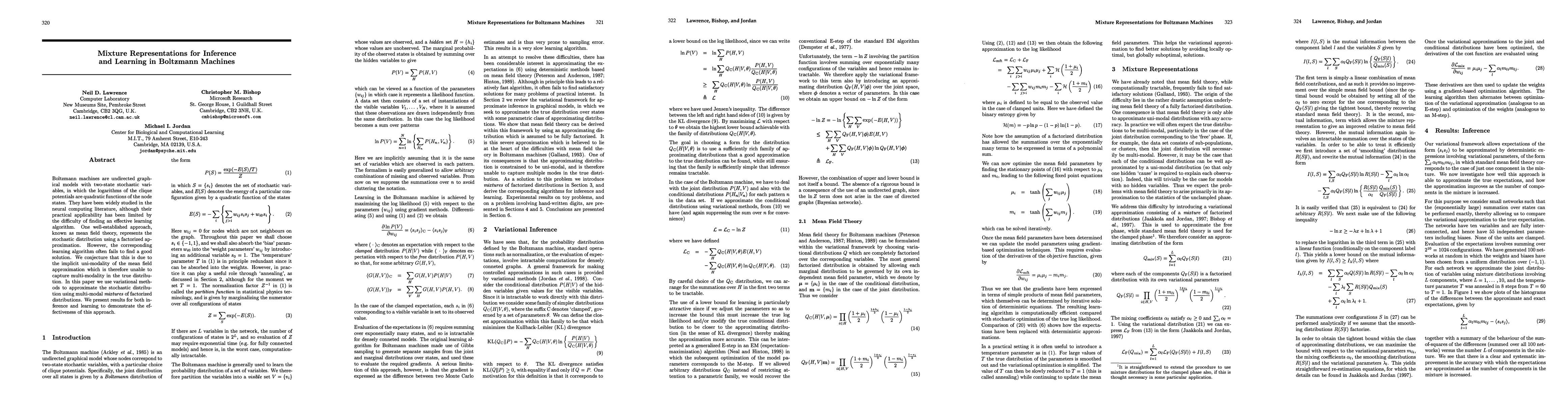 Boltzmann machines are undirected graphical models with two-state stochastic variables, in which the logarithms of the clique potentials are quadratic functions of the node states. They have been widely studied in the neural computing literature, although their practical applicability has been limited by the difficulty of finding an effective learning algorithm. One well-established approach, known as mean field theory, represents the stochastic distribution using a factorized approximation. However, the corresponding learning algorithm often fails to find a good solution. We conjecture that this is due to the implicit uni-modality of the mean field approximation which is therefore unable to capture multi-modality in the true distribution. In this paper we use variational methods to approximate the stochastic distribution using multi-modal mixtures of factorized distributions. We present results for both inference and learning to demonstrate the effectiveness of this approach.