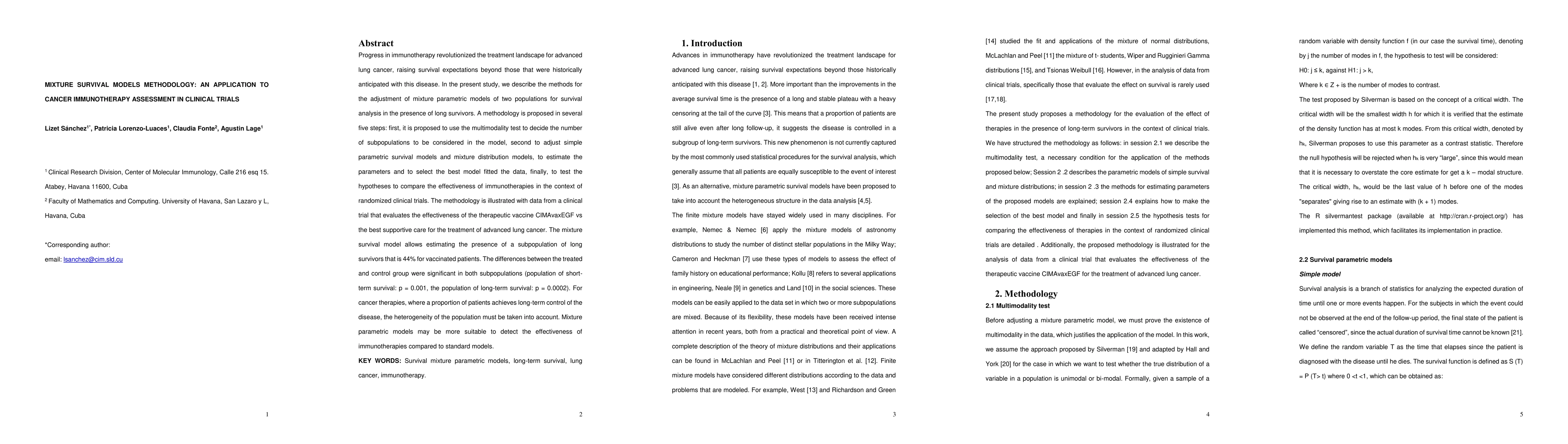 Progress in immunotherapy revolutionized the treatment landscape for advanced lung cancer, raising survival expectations beyond those that were historically anticipated with this disease. In the present study, we describe the methods for the adjustment of mixture parametric models of two populations for survival analysis in the presence of long survivors. A methodology is proposed in several five steps: first, it is proposed to use the multimodality test to decide the number of subpopulations to be considered in the model, second to adjust simple parametric survival models and mixture distribution models, to estimate the parameters and to select the best model fitted the data, finally, to test the hypotheses to compare the effectiveness of immunotherapies in the context of randomized clinical trials. The methodology is illustrated with data from a clinical trial that evaluates the effectiveness of the therapeutic vaccine CIMAvaxEGF vs the best supportive care for the treatment of advanced lung cancer. The mixture survival model allows estimating the presence of a subpopulation of long survivors that is 44% for vaccinated patients. The differences between the treated and control group were significant in both subpopulations (population of short-term survival: p = 0.001, the population of long-term survival: p = 0.0002). For cancer therapies, where a proportion of patients achieves long-term control of the disease, the heterogeneity of the population must be taken into account. Mixture parametric models may be more suitable to detect the effectiveness of immunotherapies compared to standard models.