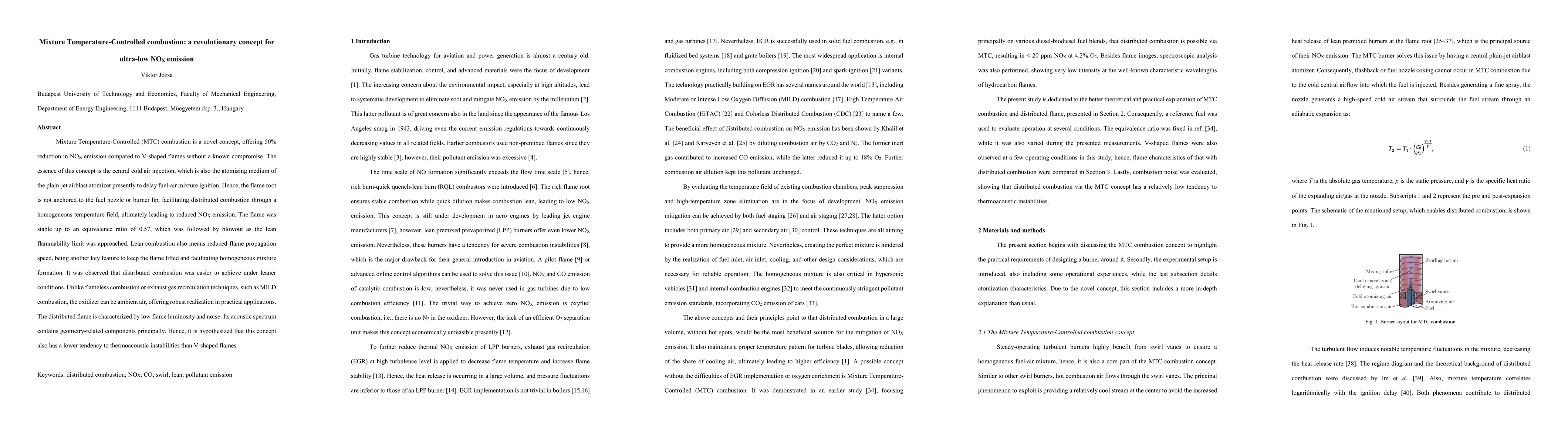 Mixture Temperature-Controlled (MTC) combustion achieves a 50% reduction in NOx emissions compared to traditional V-shaped flames while maintaining flame stability and facilitating homogeneous mixture formation. This method utilizes ambient air for distributed combustion, resulting in low flame luminosity, noise, and reduced thermoacoustic instabilities.