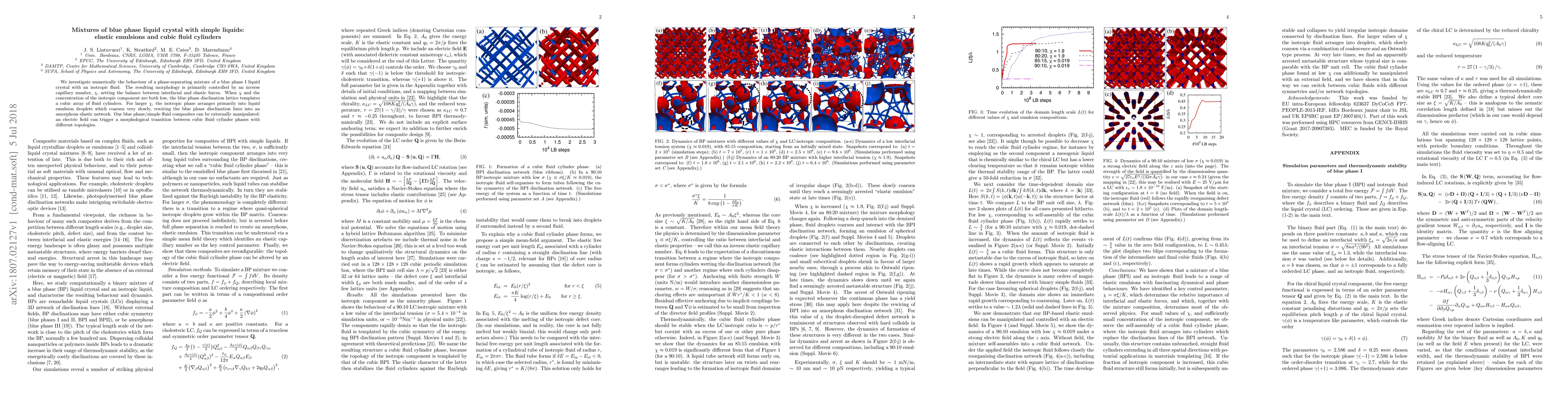 We investigate numerically the behaviour of a phase-separating mixture of a blue phase I liquid crystal with an isotropic fluid. The resulting morphology is primarily controlled by an inverse capillary number, $\chi$, setting the balance between interfacial and elastic forces. When $\chi$ and the concentration of the isotropic component are both low, the blue phase disclination lattice templates a cubic array of fluid cylinders. For larger $\chi$, the isotropic phase arranges primarily into liquid emulsion droplets which coarsen very slowly, rewiring the blue phase disclination lines into an amorphous elastic network. Our blue phase/simple fluid composites can be externally manipulated: an electric field can trigger a morphological transition between cubic fluid cylinder phases with different topologies.
