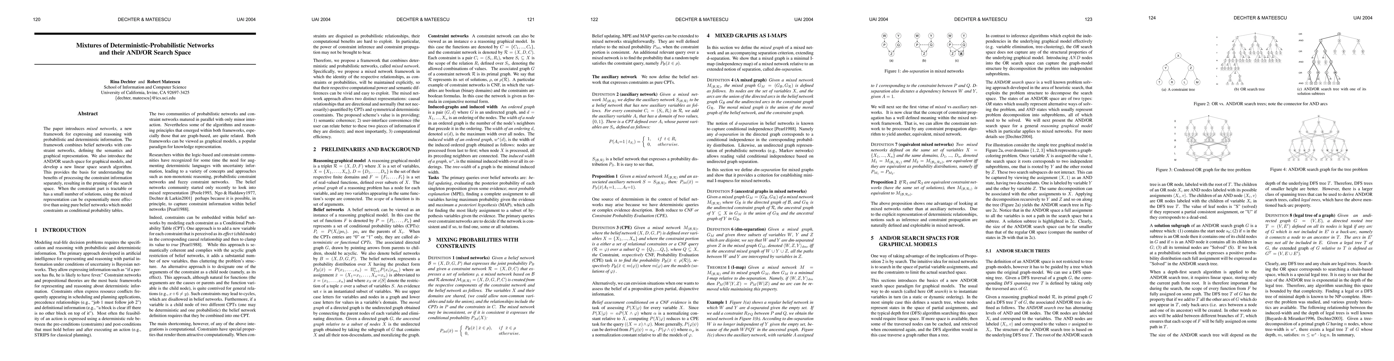The paper introduces mixed networks, a new framework for expressing and reasoning with probabilistic and deterministic information. The framework combines belief networks with constraint networks, defining the semantics and graphical representation. We also introduce the AND/OR search space for graphical models, and develop a new linear space search algorithm. This provides the basis for understanding the benefits of processing the constraint information separately, resulting in the pruning of the search space. When the constraint part is tractable or has a small number of solutions, using the mixed representation can be exponentially more effective than using pure belief networks which odel constraints as conditional probability tables.