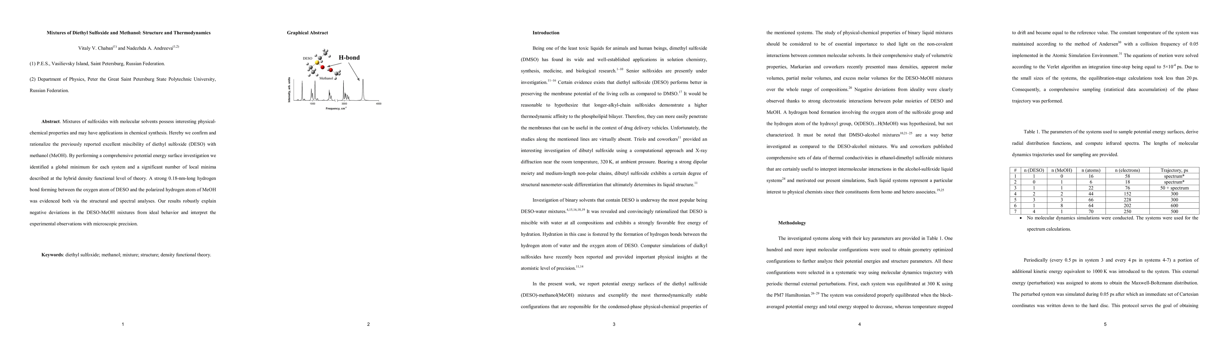 Mixtures of sulfoxides with molecular solvents possess interesting physical-chemical properties and may have applications in chemical synthesis. Hereby we confirm and rationalize the previously reported excellent miscibility of diethyl sulfoxide (DESO) with methanol (MeOH). By performing a comprehensive potential energy surface investigation we identified a global minimum for each system and a significant number of local minima described at the hybrid density functional level of theory. A strong 0.18-nm-long hydrogen bond forming between the oxygen atom of DESO and the polarized hydrogen atom of MeOH was evidenced both via the structural and spectral analyses. Our results robustly explain negative deviations in the DESO-MeOH mixtures from ideal behavior and interpret the experimental observations with microscopic precision.