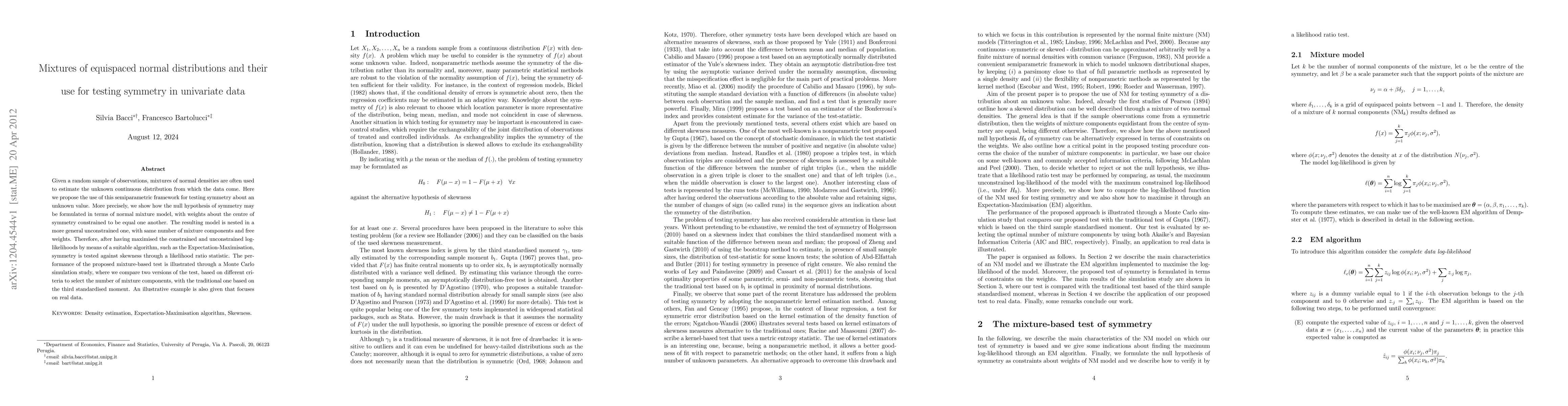Given a random sample of observations, mixtures of normal densities are often used to estimate the unknown continuous distribution from which the data come. Here we propose the use of this semiparametric framework for testing symmetry about an unknown value. More precisely, we show how the null hypothesis of symmetry may be formulated in terms of normal mixture model, with weights about the centre of symmetry constrained to be equal one another. The resulting model is nested in a more general unconstrained one, with same number of mixture components and free weights. Therefore, after having maximised the constrained and unconstrained log-likelihoods by means of a suitable algorithm, such as the Expectation-Maximisation, symmetry is tested against skewness through a likelihood ratio statistic. The performance of the proposed mixture-based test is illustrated through a Monte Carlo simulation study, where we compare two versions of the test, based on different criteria to select the number of mixture components, with the traditional one based on the third standardised moment. An illustrative example is also given that focuses on real data.