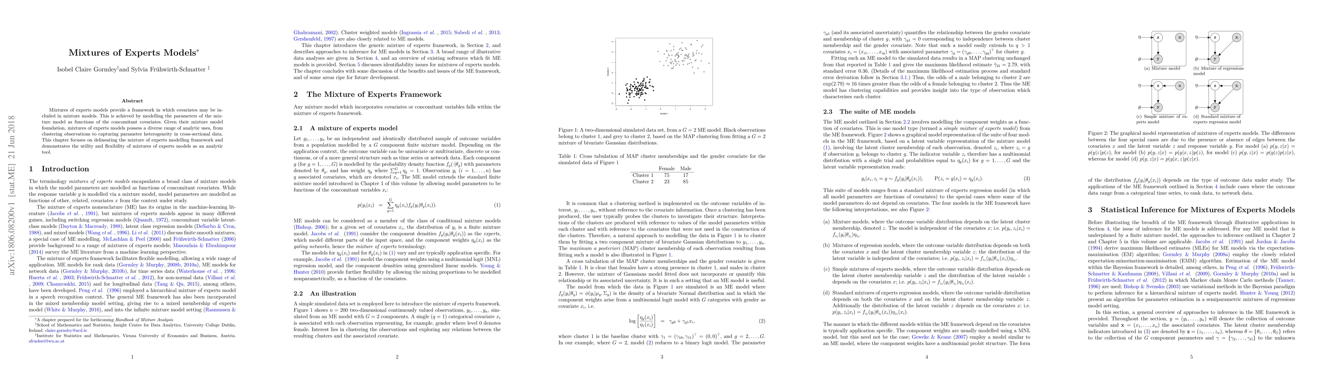 Mixtures of experts models integrate covariates into mixture models, allowing parameters to be functions of these covariates. This framework offers versatile analytical applications, including clustering and capturing parameter heterogeneity in cross-sectional data.