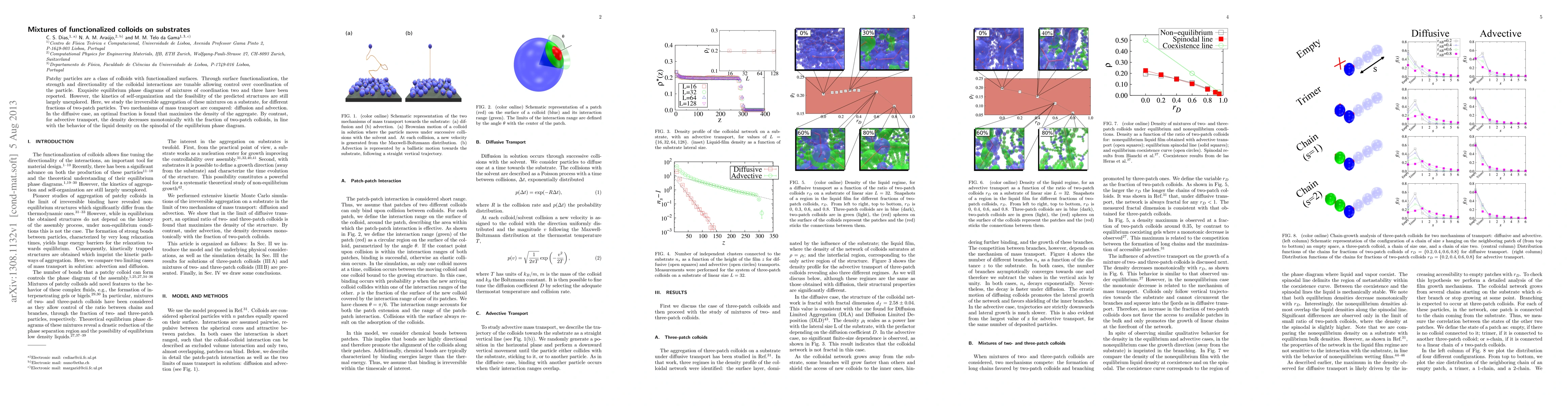 This paper investigates the irreversible aggregation of mixtures of functionalized colloids on substrates, focusing on the kinetics of self-organization and the mechanisms of mass transport. It finds an optimal fraction for maximum aggregate density under diffusion, while advection leads to a monotonic decrease in density, aligning with equilibrium phase diagram behavior.