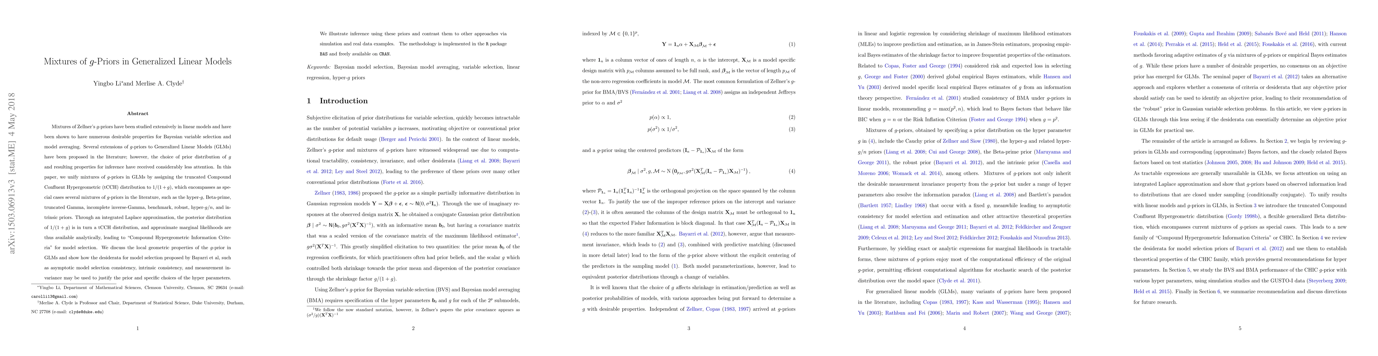 This paper proposes a unified framework for mixtures of g-priors in Generalized Linear Models (GLMs) using the truncated Compound Confluent Hypergeometric (tCCH) distribution. It provides analytical approximations for marginal likelihoods and introduces "Compound Hypergeometric Information Criteria" for model selection, supported by simulation and real data examples.