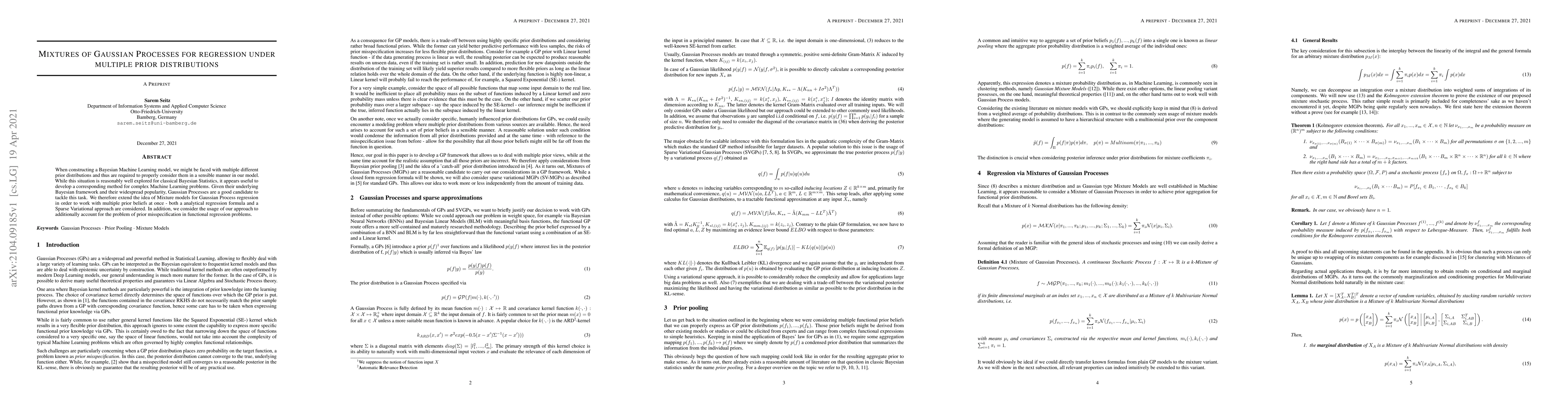 This paper proposes a method for Gaussian Process regression that incorporates mixtures to handle multiple prior distributions in Bayesian Machine Learning models. The approach includes both an analytical regression formula and a Sparse Variational method, aiming to address the issue of prior misspecification in functional regression problems.
