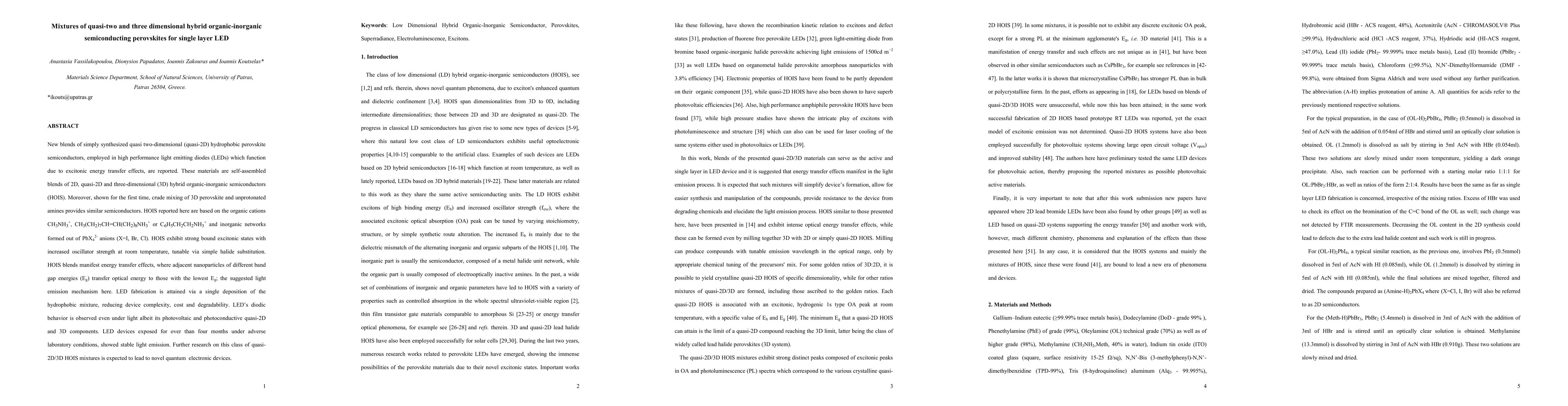 New blends of simply synthesized quasi two-dimensional (quasi-2D) hydrophobic perovskite semiconductors, employed in high performance light emitting diodes (LEDs) which function due to excitonic energy transfer effects, are reported. These materials are self-assembled blends of 2D, quasi-2D and three-dimensional (3D) hybrid organic-inorganic semiconductors (HOIS). Moreover, shown for the first time, crude mixing of 3D perovskite and unprotonated amines provides similar semiconductors. HOIS reported here are based on the organic cations CH3NH3+, CH3(CH2)7CH=CH(CH2)8NH3+ or C6H5CH2CH2NH3+ and inorganic networks formed out of PbX42- anions (X=I, Br, Cl). HOIS exhibit strong bound excitonic states with increased oscillator strength at room temperature, tunable via simple halide substitution. HOIS blends manifest energy transfer effects, where adjacent nanoparticles of different band gap energies (Eg) transfer optical energy to those with the lowest Eg; the suggested light emission mechanism here. LED fabrication is attained via a single deposition of the hydrophobic mixture, reducing device complexity, cost and degradability. LED's diodic behavior is observed even under light albeit its photovoltaic and photoconductive quasi-2D and 3D components. LED devices exposed for over than four months under adverse laboratory conditions, showed stable light emission. Further research on this class of quasi-2D/3D HOIS mixtures is expected to lead to novel quantum electronic devices.
