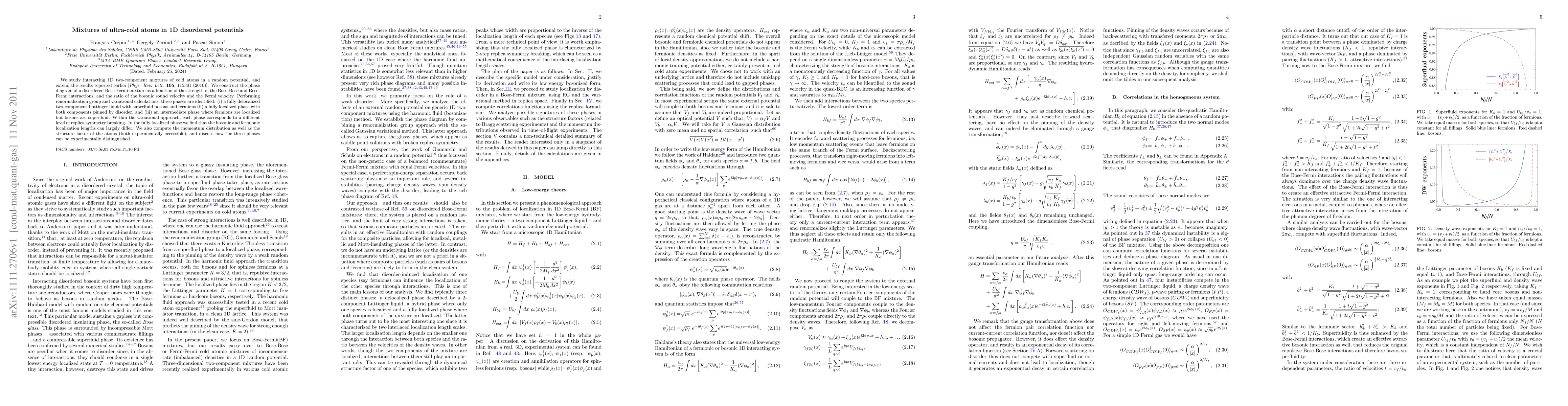 We study interacting 1D two-component mixtures of cold atoms in a random potential, and extend the results reported earlier [{\it Phys. Rev. Lett.} {\bf 105}, 115301 (2010)]. We construct the phase diagram of a disordered Bose-Fermi mixture as a function of the strength of the Bose-Bose and Bose-Fermi interactions, and the ratio of the bosonic sound velocity and the Fermi velocity. Performing renormalization group and variational calculations, three phases are identified: (i) a fully delocalized two-component Luttinger liquid with superfluid bosons and fermions (ii) a fully localized phase with both components pinned by disorder, and (iii) an intermediate phase where fermions are localized but bosons are superfluid. Within the variational approach, each phase corresponds to a different level of replica symmetry breaking. In the fully localized phase we find that the bosonic and fermionic localization lengths can largely differ. We also compute the momentum distribution as well as the structure factor of the atoms (both experimentally accessible), and discuss how the three phases can be experimentally distinguished.