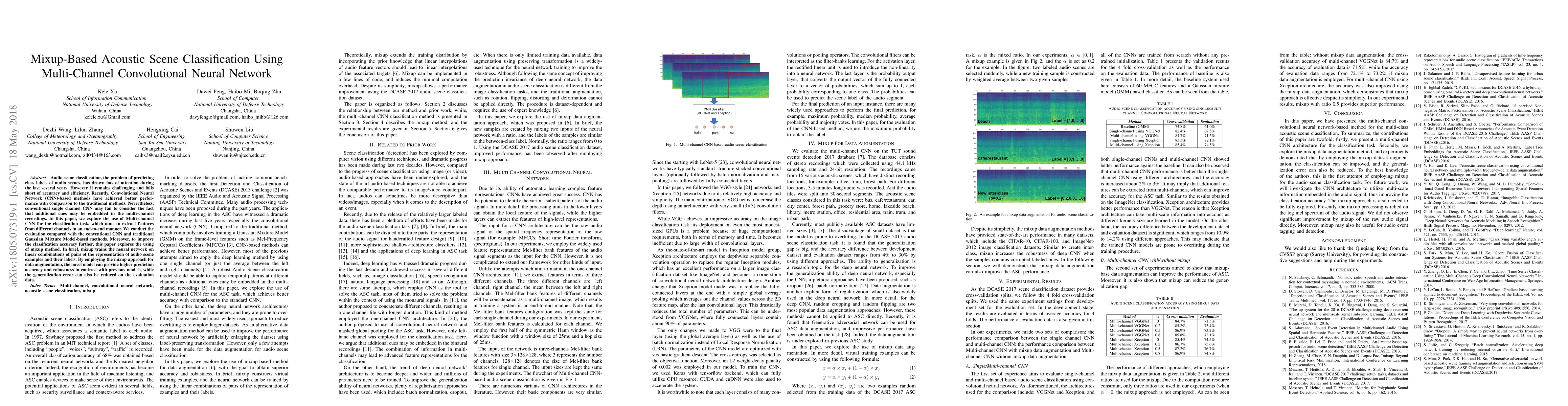 This paper proposes a Multi-channel Convolutional Neural Network (CNN) combined with mixup for improved acoustic scene classification. The model extracts features from multiple channels to capture additional cues, leading to higher accuracy and robustness compared to conventional CNN and traditional methods.