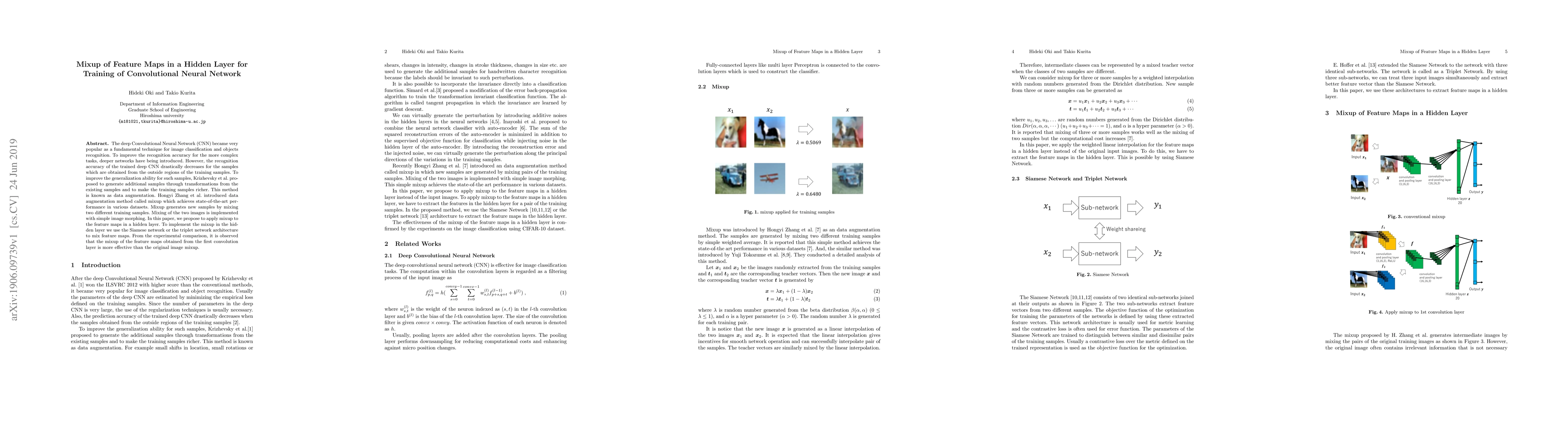 The deep Convolutional Neural Network (CNN) became very popular as a fundamental technique for image classification and objects recognition. To improve the recognition accuracy for the more complex tasks, deeper networks have being introduced. However, the recognition accuracy of the trained deep CNN drastically decreases for the samples which are obtained from the outside regions of the training samples. To improve the generalization ability for such samples, Krizhevsky et al. proposed to generate additional samples through transformations from the existing samples and to make the training samples richer. This method is known as data augmentation. Hongyi Zhang et al. introduced data augmentation method called mixup which achieves state-of-the-art performance in various datasets. Mixup generates new samples by mixing two different training samples. Mixing of the two images is implemented with simple image morphing. In this paper, we propose to apply mixup to the feature maps in a hidden layer. To implement the mixup in the hidden layer we use the Siamese network or the triplet network architecture to mix feature maps. From the experimental comparison, it is observed that the mixup of the feature maps obtained from the first convolution layer is more effective than the original image mixup.