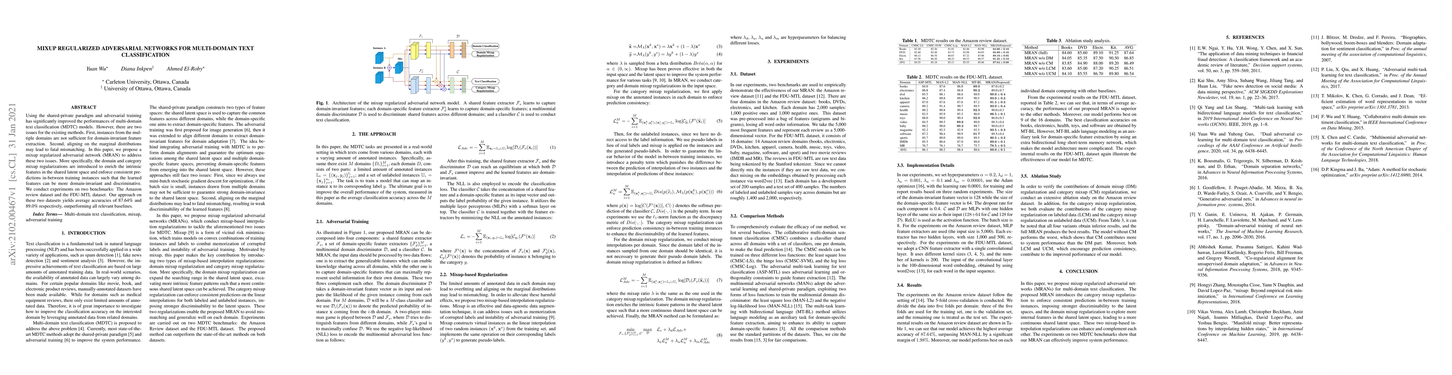 This paper proposes a mixup regularized adversarial network (MRAN) to improve multi-domain text classification by addressing insufficient domain-invariant feature extraction and potential distribution mismatches. The method achieves higher accuracy on benchmark datasets, outperforming existing baselines.