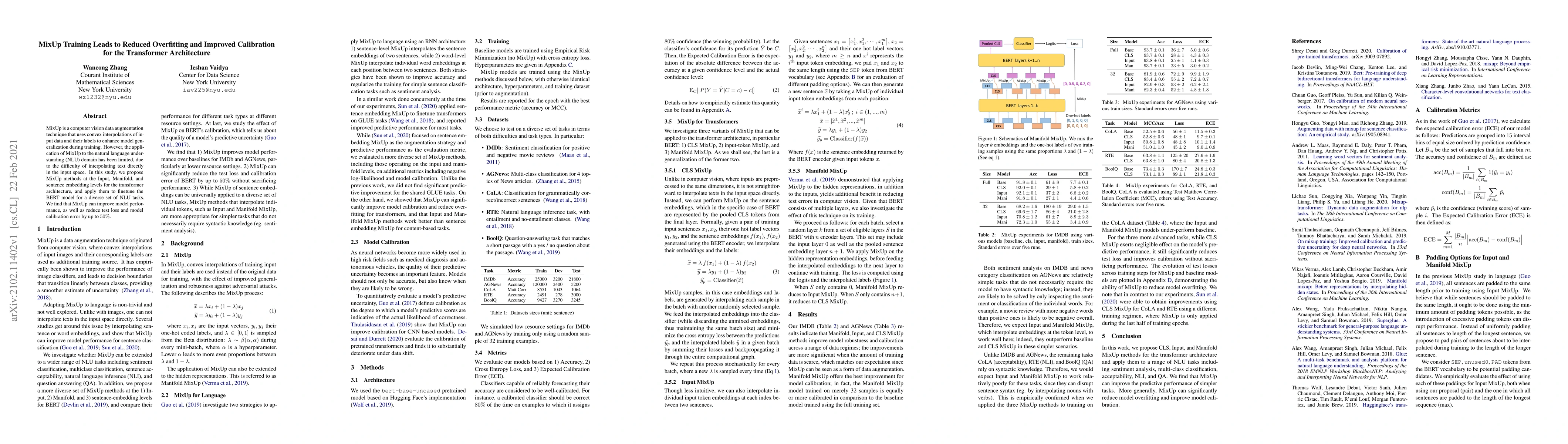 This paper proposes MixUp methods at various levels for the transformer architecture to enhance the BERT model's performance in natural language understanding tasks. The results show that MixUp can reduce overfitting, lower test loss, and improve model calibration by up to 50%.