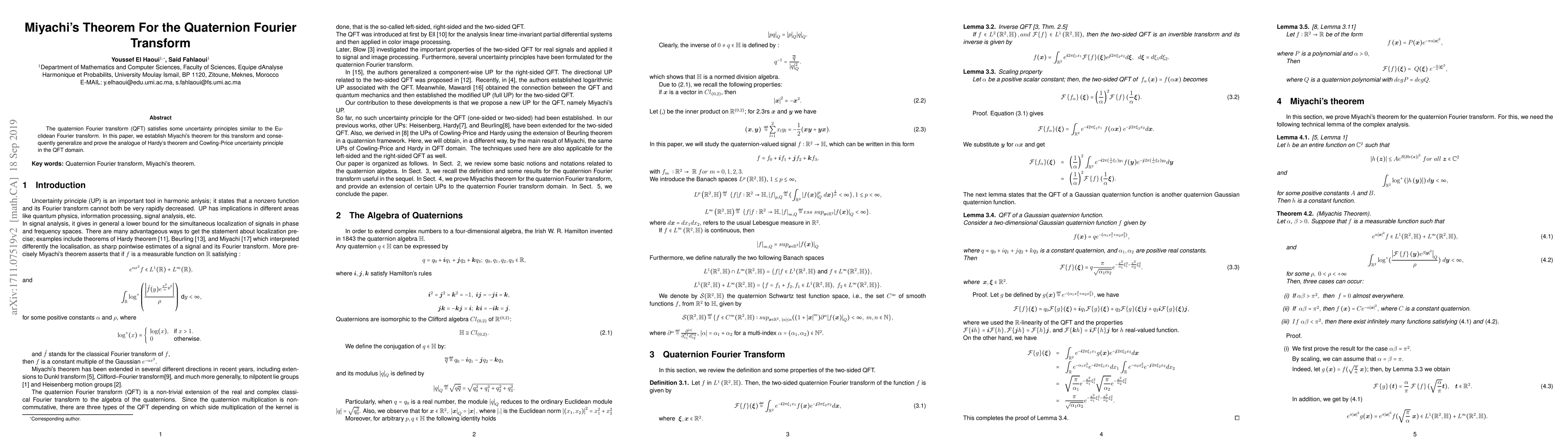 Summary: This paper establishes Miyachi's theorem for the quaternion Fourier transform, demonstrating that it adheres to uncertainty principles akin to those of the Euclidean Fourier transform.