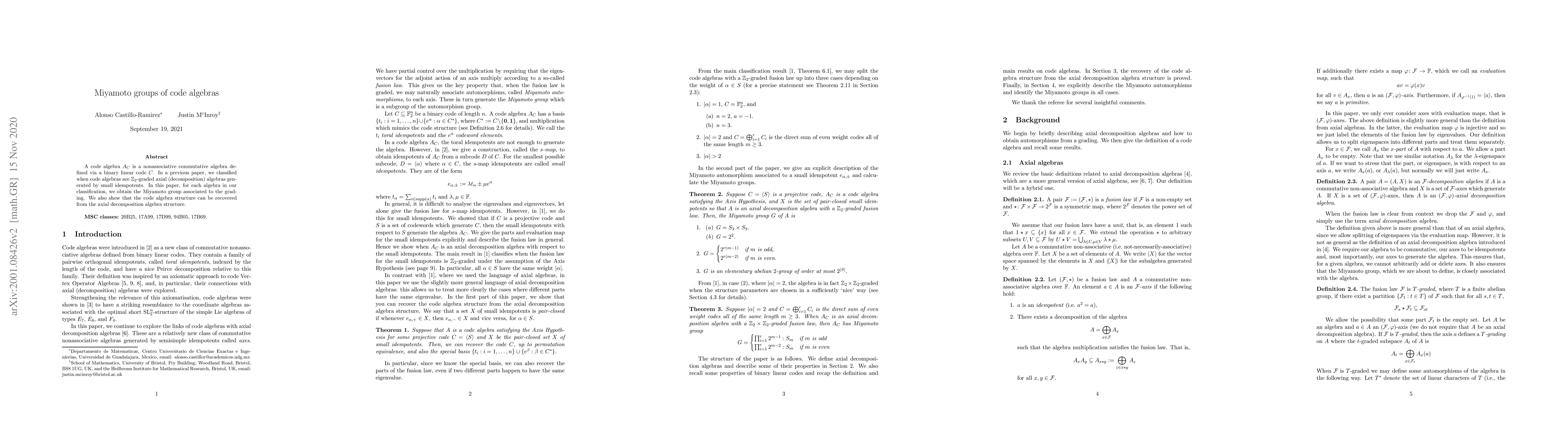 This paper classifies Miyamoto groups for $\mathbb{Z}_2$-graded axial algebras generated by small idempotents from code algebras, and demonstrates that the original code algebra structure can be retrieved from the axial decomposition algebra structure.