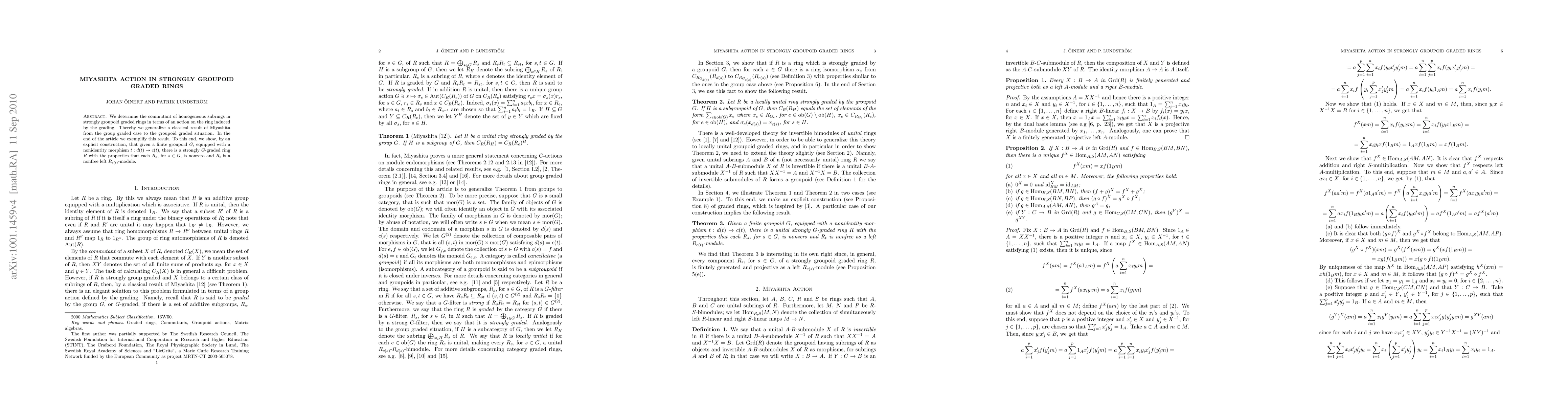 We determine the commutant of homogeneous subrings in strongly groupoid graded rings in terms of an action on the ring induced by the grading. Thereby we generalize a classical result of Miyashita from the group graded case to the groupoid graded situation. In the end of the article we exemplify this result. To this end, we show, by an explicit construction, that given a finite groupoid $G$, equipped with a nonidentity morphism $t : d(t) \to c(t)$, there is a strongly $G$-graded ring $R$ with the properties that each $R_s$, for $s \in G$, is nonzero and $R_t$ is a nonfree left $R_{c(t)}$-module.