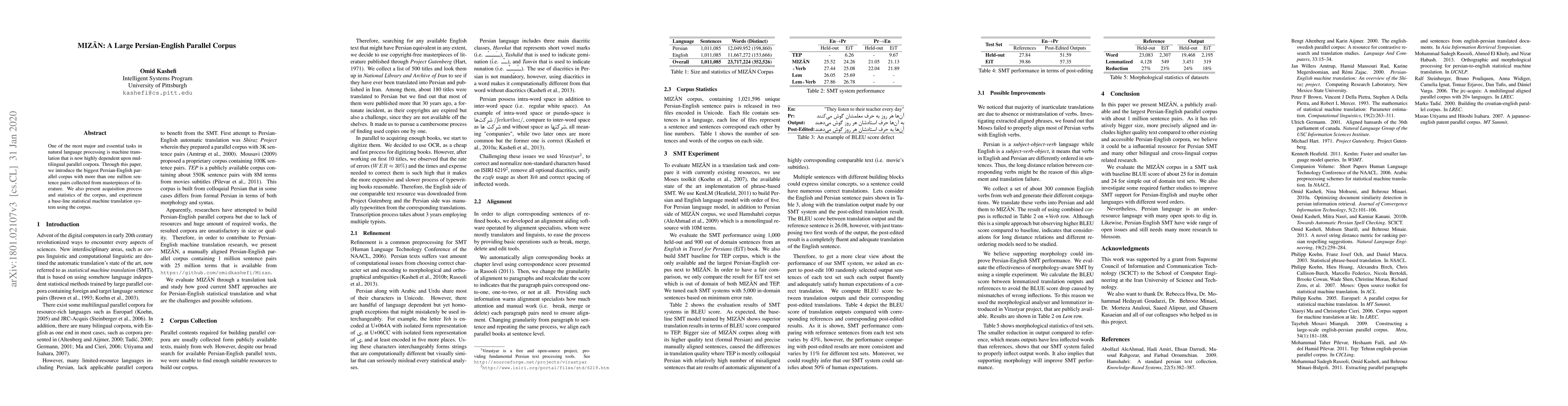 The paper introduces MIZAN, a large Persian-English parallel corpus with over one million sentence pairs from literary masterpieces, detailing its acquisition process and testing a baseline statistical machine translation system using the corpus.