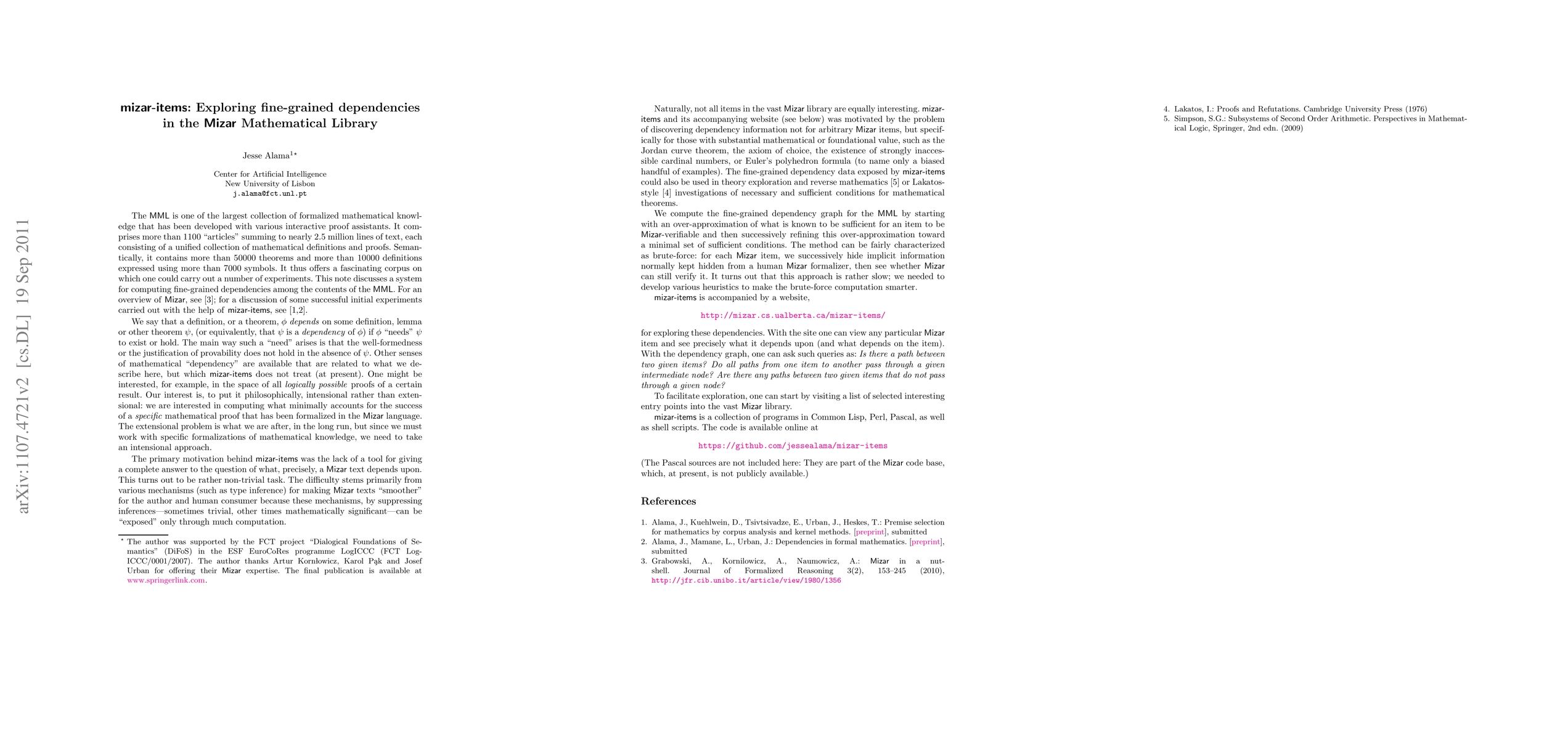 The research paper introduces mizar-items, a system designed for decomposing the Mizar Mathematical Library (MML) into fine-grained items like theorems, definitions, and notations. It also computes dependency relations among these items, facilitating foundational experiments in formalized mathematics.