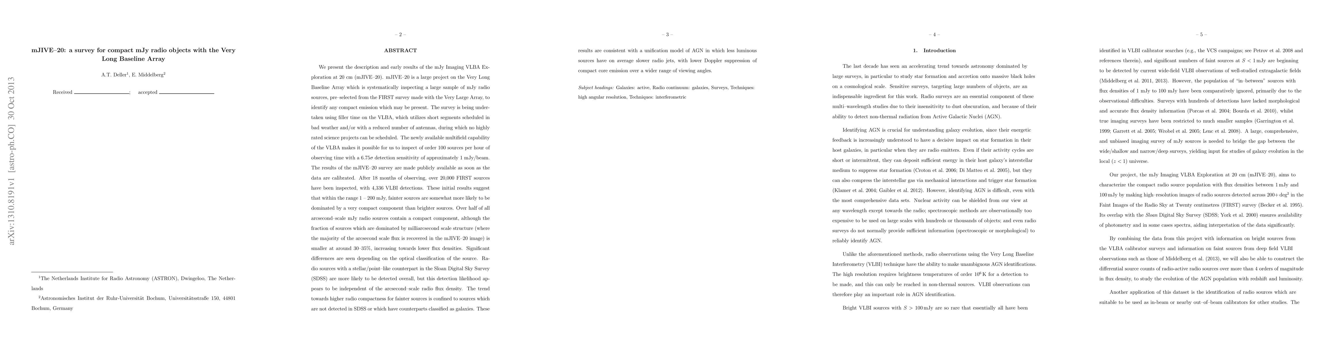 mJIVE-20 surveyed 20,000 mJy radio sources using VLBA, finding that fainter sources (1-200 mJy) are more likely to have compact emission, with 50% harboring compact components. Compactness increases with decreasing flux density, especially in SDSS galaxies and non-detections, suggesting slower, less Doppler-suppressed jets in less luminous AGN.