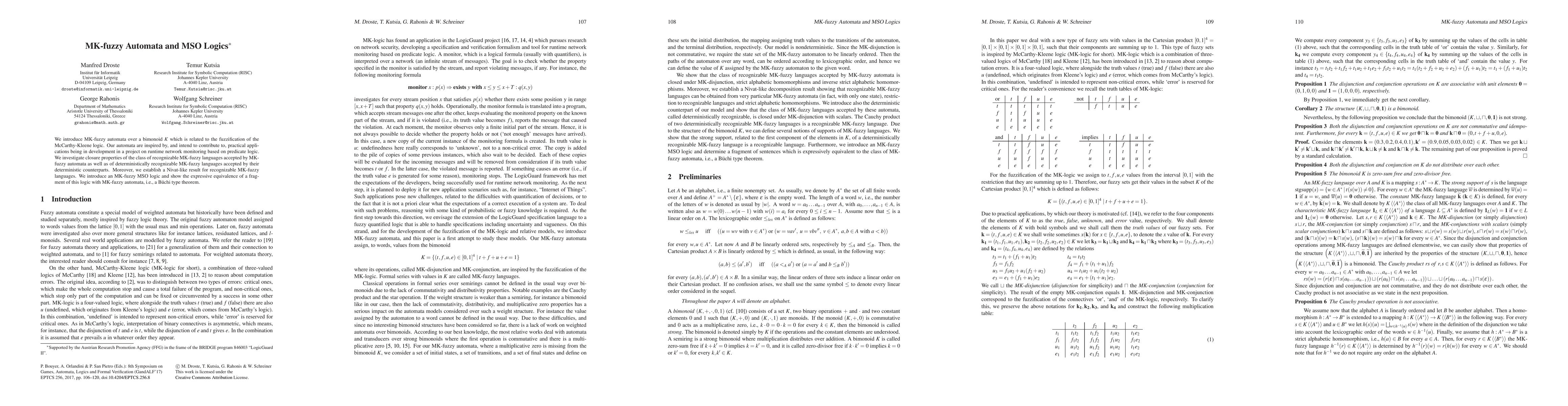 The introduction of MK-fuzzy automata and their associated MSO logic, along with proving key theorems regarding their recognizability and expressive equivalence