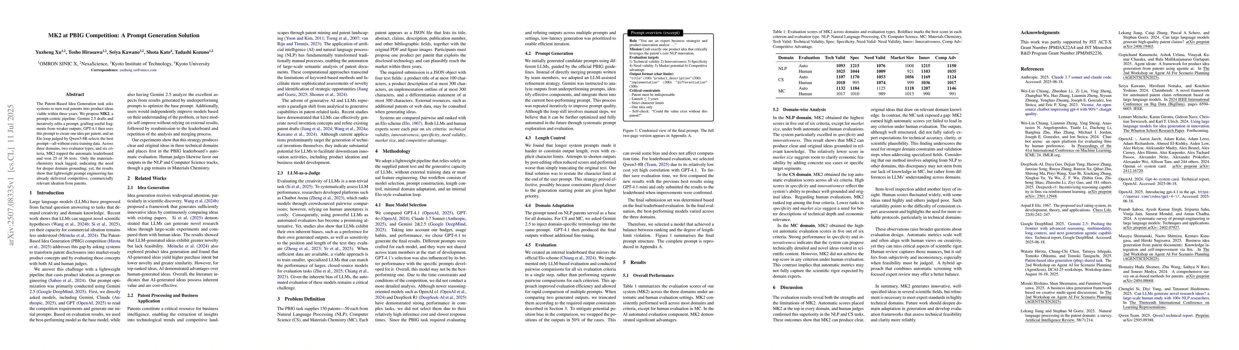 The Patent-Based Idea Generation task asks systems to turn real patents into product ideas viable within three years. We propose MK2, a prompt-centric pipeline: Gemini 2.5 drafts and iteratively edits a prompt, grafting useful fragments from weaker outputs; GPT-4.1 then uses this prompt to create one idea per patent, and an Elo loop judged by Qwen3-8B selects the best prompt-all without extra training data. Across three domains, two evaluator types, and six criteria, MK2 topped the automatic leaderboard and won 25 of 36 tests. Only the materials-chemistry track lagged, indicating the need for deeper domain grounding; yet, the results show that lightweight prompt engineering has already delivered competitive, commercially relevant ideation from patents.