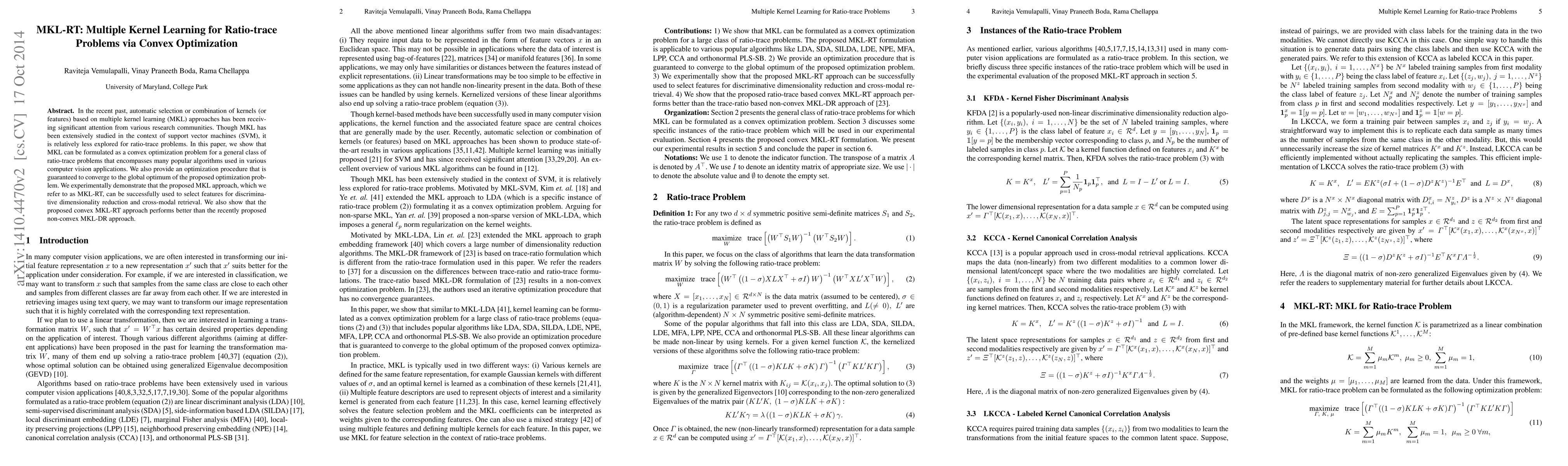 This paper introduces MKL-RT, a convex optimization approach for multiple kernel learning in ratio-trace problems, demonstrating improved performance over non-convex methods for feature selection and dimensionality reduction.