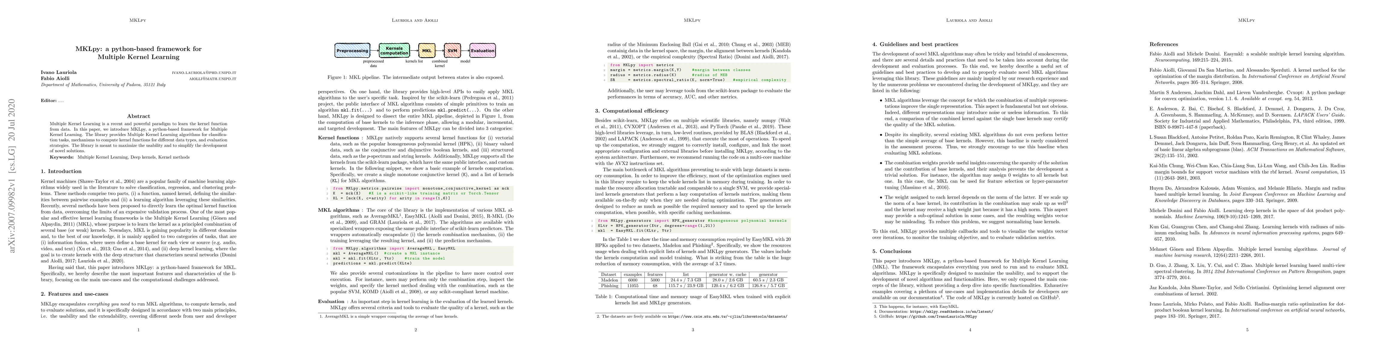 Summary: MKLpy is a Python-based framework for Multiple Kernel Learning, offering algorithms for classification, kernel computation mechanisms, and evaluation strategies, designed to enhance usability and facilitate the development of new solutions.