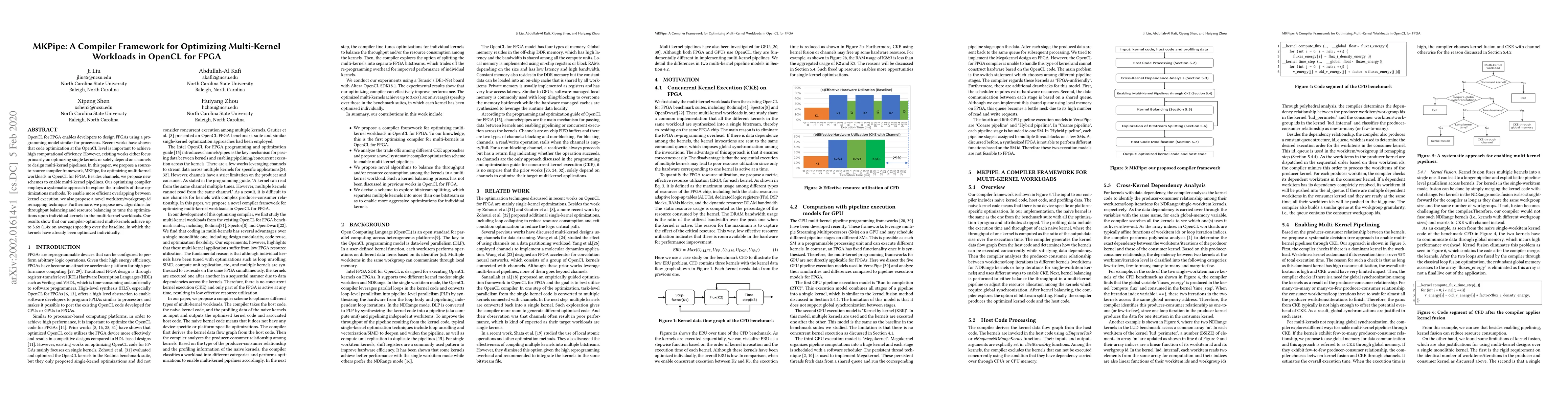 MKPipe is a compiler framework designed to optimize multi-kernel workloads in OpenCL for FPGA, employing new schemes beyond channels to enable multi-kernel pipelines and introducing techniques for remapping and balancing to achieve up to 3.6x speedup over baseline optimizations.