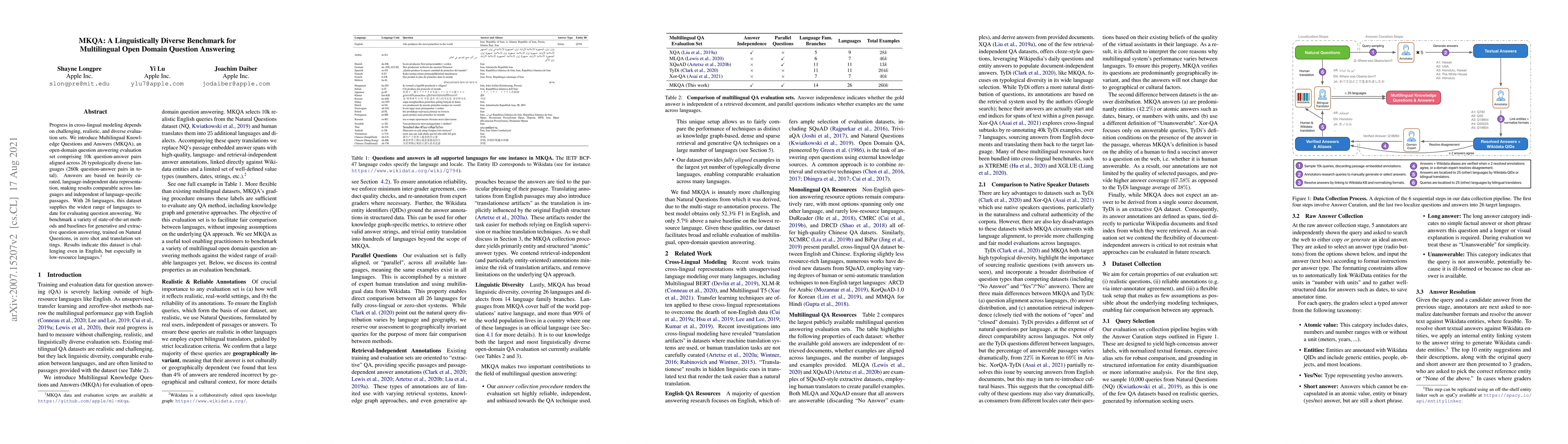 The MKQA dataset introduces a multilingual benchmark for open-domain question answering, featuring 10k question-answer pairs across 26 languages, aiming to evaluate cross-lingual modeling. Benchmarking results show the dataset's challenge, especially for low-resource languages.