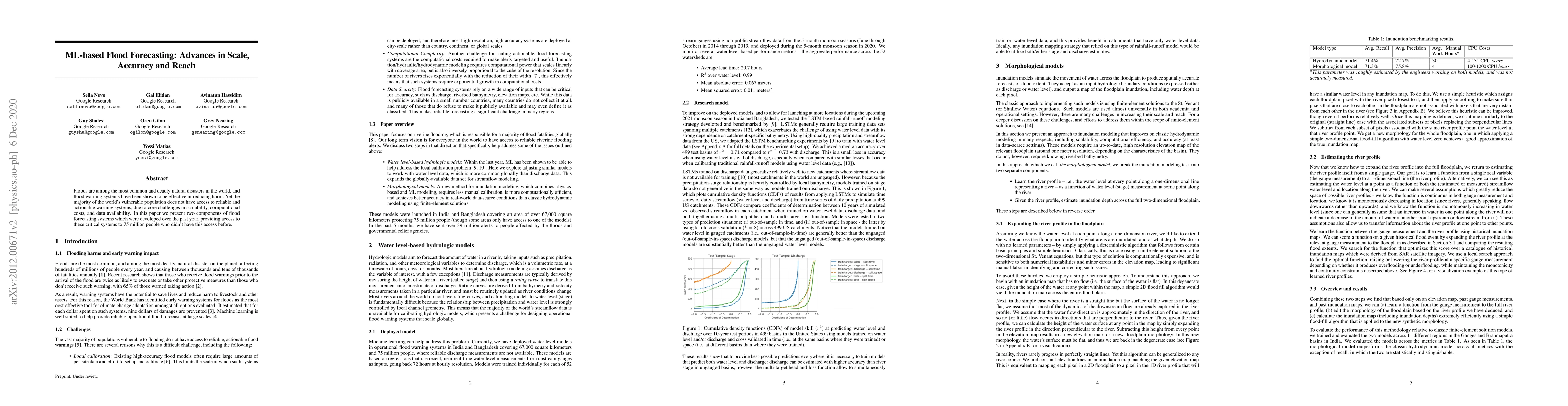 This paper introduces advanced machine learning techniques to enhance flood forecasting systems, addressing scalability, computational costs, and data availability issues, thereby extending reliable flood warning access to 75 million previously underserved individuals.