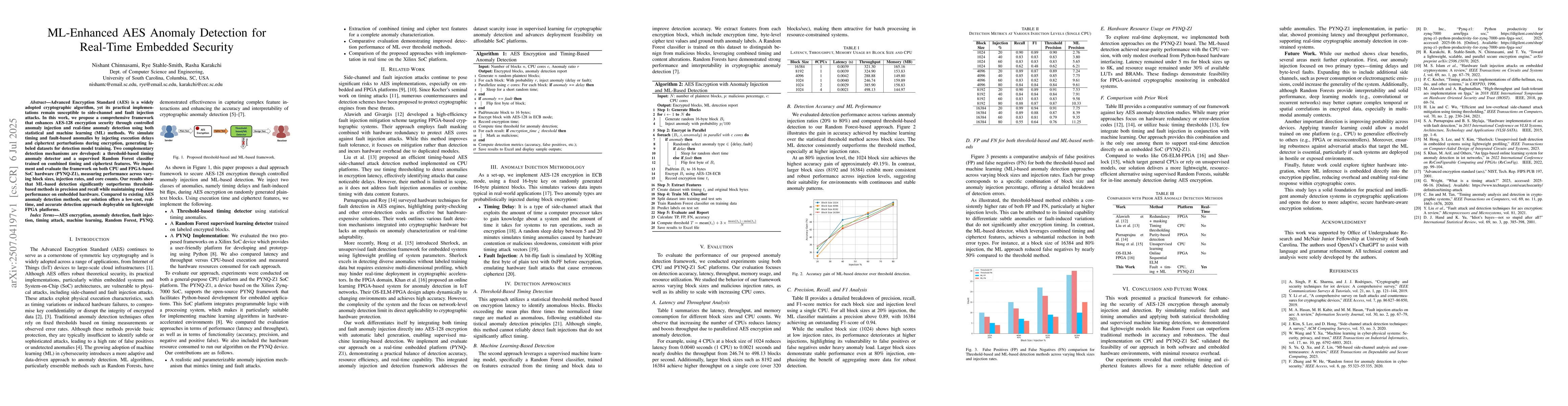 Advanced Encryption Standard (AES) is a widely adopted cryptographic algorithm, yet its practical implementations remain susceptible to side-channel and fault injection attacks. In this work, we propose a comprehensive framework that enhances AES-128 encryption security through controlled anomaly injection and real-time anomaly detection using both statistical and machine learning (ML) methods. We simulate timing and fault-based anomalies by injecting execution delays and ciphertext perturbations during encryption, generating labeled datasets for detection model training. Two complementary detection mechanisms are developed: a threshold-based timing anomaly detector and a supervised Random Forest classifier trained on combined timing and ciphertext features. We implement and evaluate the framework on both CPU and FPGA-based SoC hardware (PYNQ-Z1), measuring performance across varying block sizes, injection rates, and core counts. Our results show that ML-based detection significantly outperforms threshold-based methods in precision and recall while maintaining real-time performance on embedded hardware. Compared to existing AES anomaly detection methods, our solution offers a low-cost, real-time, and accurate detection approach deployable on lightweight FPGA platforms.