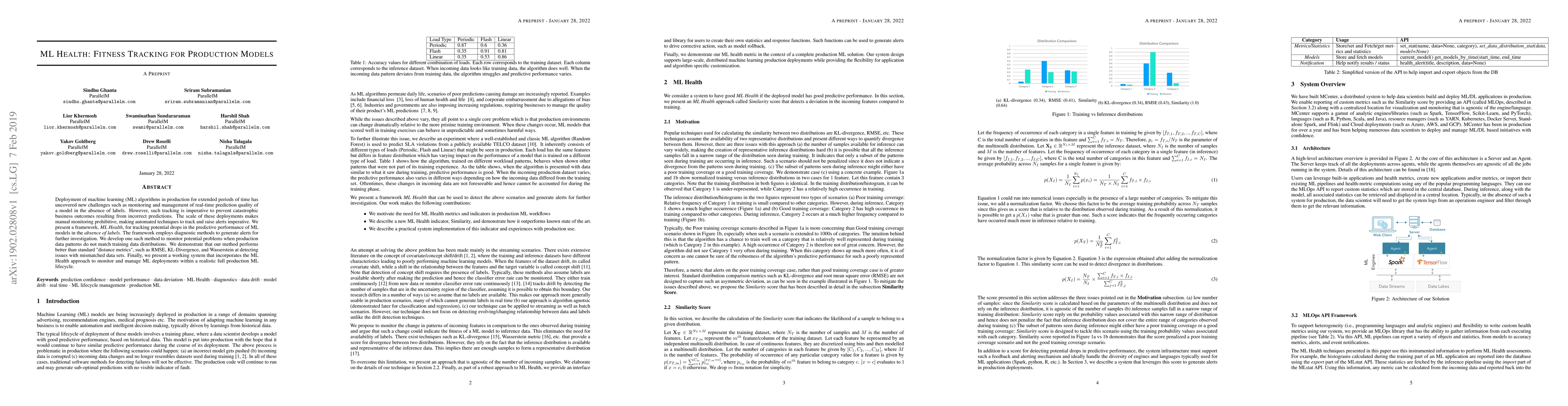 Deployment of machine learning (ML) algorithms in production for extended periods of time has uncovered new challenges such as monitoring and management of real-time prediction quality of a model in the absence of labels. However, such tracking is imperative to prevent catastrophic business outcomes resulting from incorrect predictions. The scale of these deployments makes manual monitoring prohibitive, making automated techniques to track and raise alerts imperative. We present a framework, ML Health, for tracking potential drops in the predictive performance of ML models in the absence of labels. The framework employs diagnostic methods to generate alerts for further investigation. We develop one such method to monitor potential problems when production data patterns do not match training data distributions. We demonstrate that our method performs better than standard "distance metrics", such as RMSE, KL-Divergence, and Wasserstein at detecting issues with mismatched data sets. Finally, we present a working system that incorporates the ML Health approach to monitor and manage ML deployments within a realistic full production ML lifecycle.
