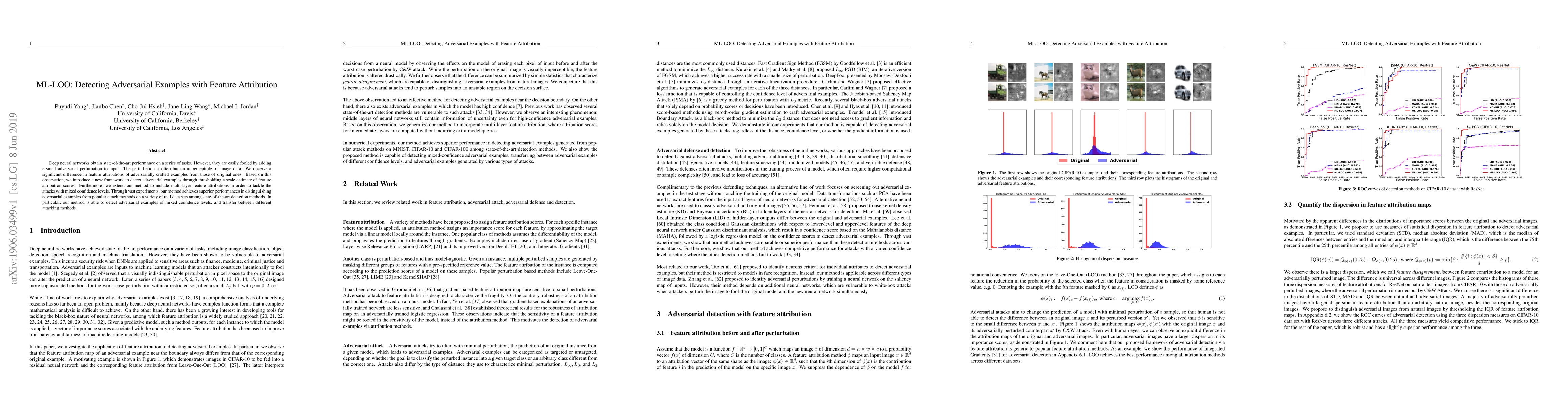 The paper proposes ML-LOO, a framework for detecting adversarial examples by analyzing differences in feature attributions between perturbed and original inputs. The method achieves superior performance in identifying adversarial examples across various datasets and attack methods, especially those with mixed confidence levels.