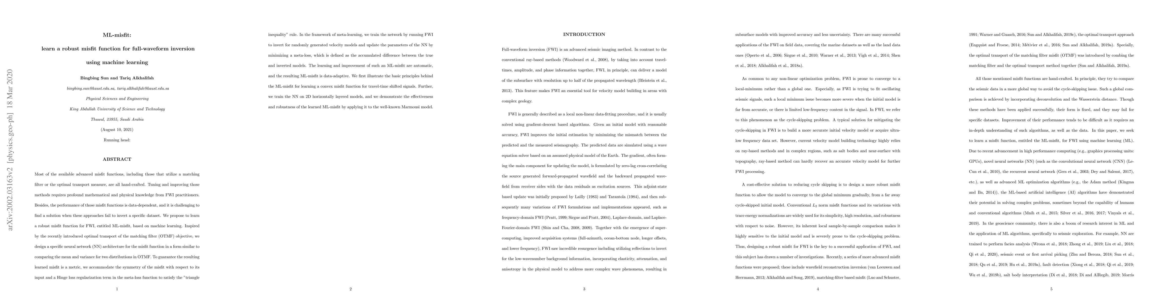 This paper proposes ML-misfit, a machine learning-based misfit function for full waveform inversion (FWI), using a neural network architecture inspired by optimal transport. The network is trained via meta-learning to minimize a meta-loss function that ensures the learned misfit is a metric, demonstrating robustness on both simple and complex models like Marmousi.
