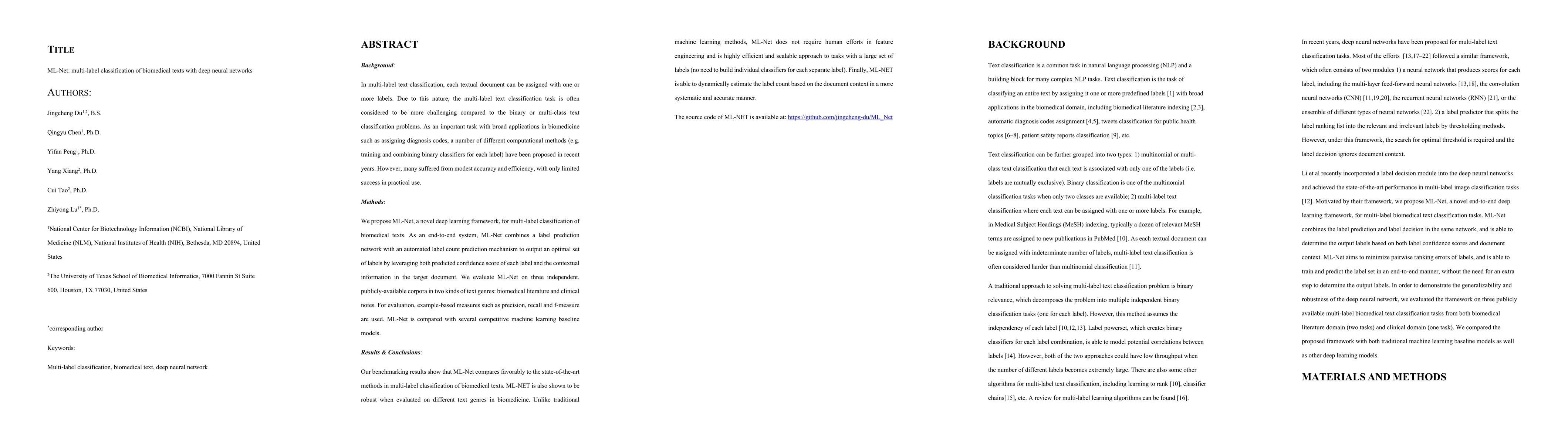 ML-Net is a novel deep learning framework for multi-label classification of biomedical texts, combining a label prediction network with an automated label count prediction mechanism. It outperforms traditional methods and state-of-the-art models in precision, recall, and f-measure across different biomedical text genres, demonstrating efficiency, scalability, and robust performance.