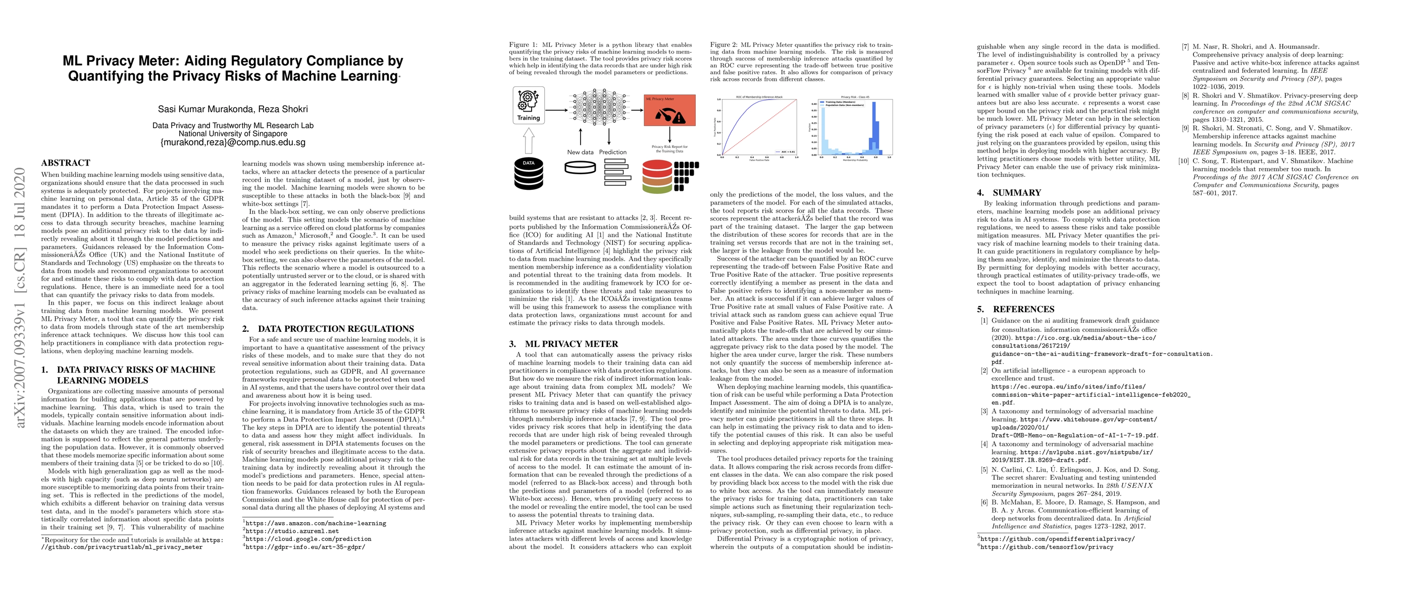 The paper introduces ML Privacy Meter, a tool designed to quantify the privacy risks posed by machine learning models to sensitive data, aiding compliance with data protection regulations like GDPR. It leverages membership inference attack techniques to assess the indirect data leakage from models, helping organizations perform necessary assessments.