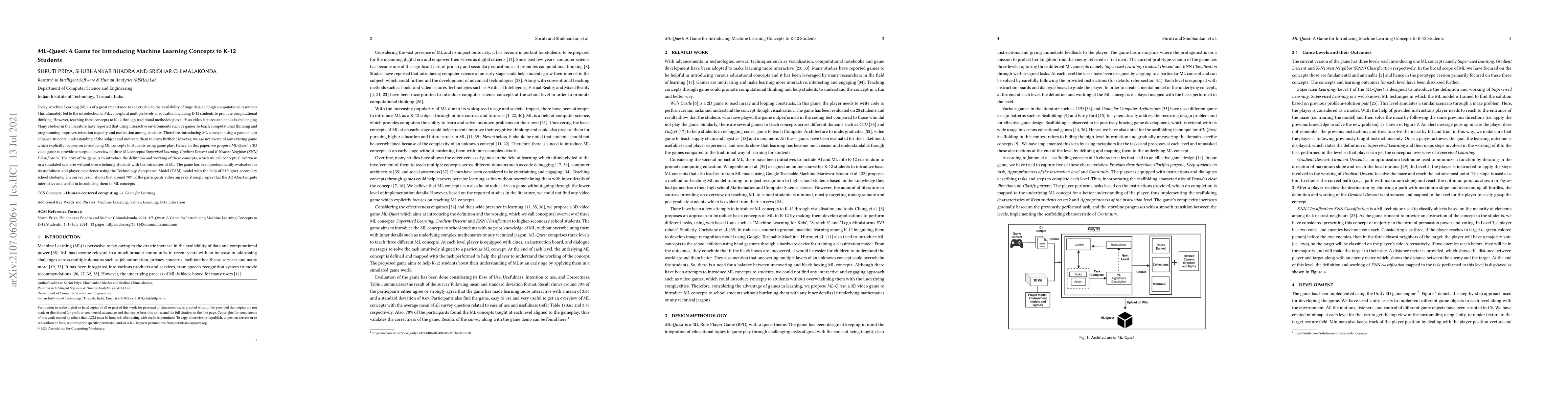 ML-Quest is a 3D video game designed to introduce K-12 students to machine learning concepts like Supervised Learning, Gradient Descent, and KNN Classification. The game aims to provide a conceptual overview of these topics in a fun, engaging manner, enhancing understanding and motivation. Initial evaluation with higher-secondary students indicates that 70% found it interactive and useful.