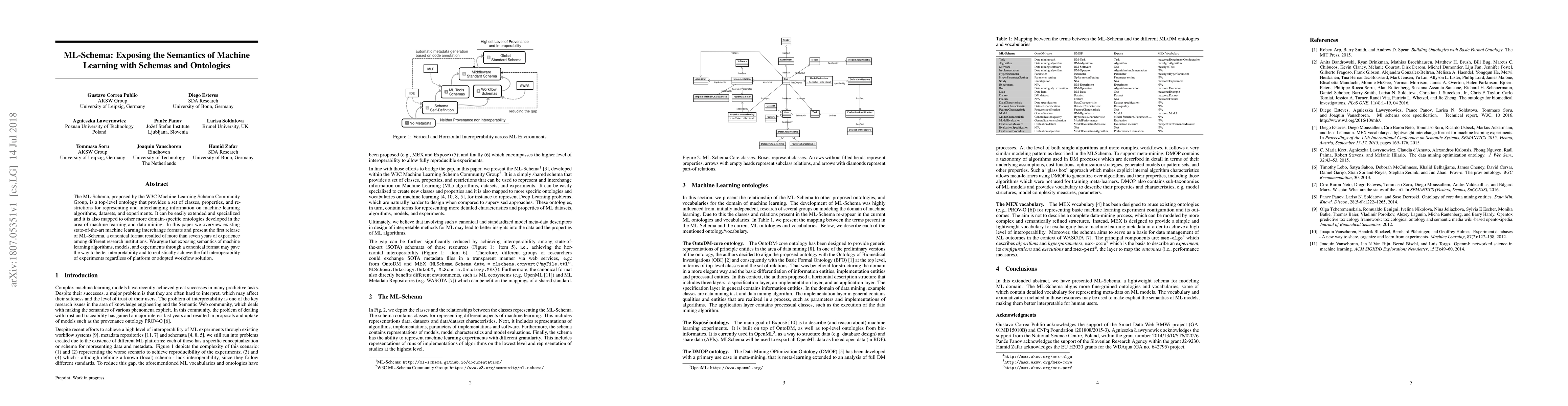 The ML-Schema, proposed by the W3C Machine Learning Schema Community Group, is a top-level ontology that provides a set of classes, properties, and restrictions for representing and interchanging information on machine learning algorithms, datasets, and experiments. It can be easily extended and specialized and it is also mapped to other more domain-specific ontologies developed in the area of machine learning and data mining. In this paper we overview existing state-of-the-art machine learning interchange formats and present the first release of ML-Schema, a canonical format resulted of more than seven years of experience among different research institutions. We argue that exposing semantics of machine learning algorithms, models, and experiments through a canonical format may pave the way to better interpretability and to realistically achieve the full interoperability of experiments regardless of platform or adopted workflow solution.