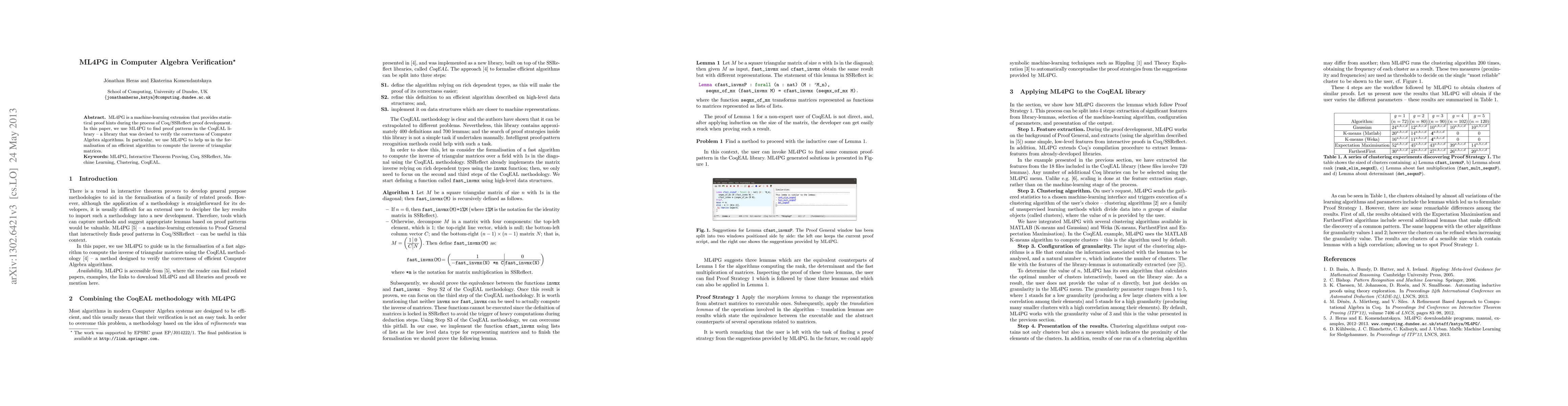 Summary: ML4PG assists in Coq/SSReflect proof development by providing statistical proof hints. The paper applies ML4PG to identify proof patterns in the CoqEAL library and aids in formalizing an efficient algorithm for computing the inverse of triangular matrices.